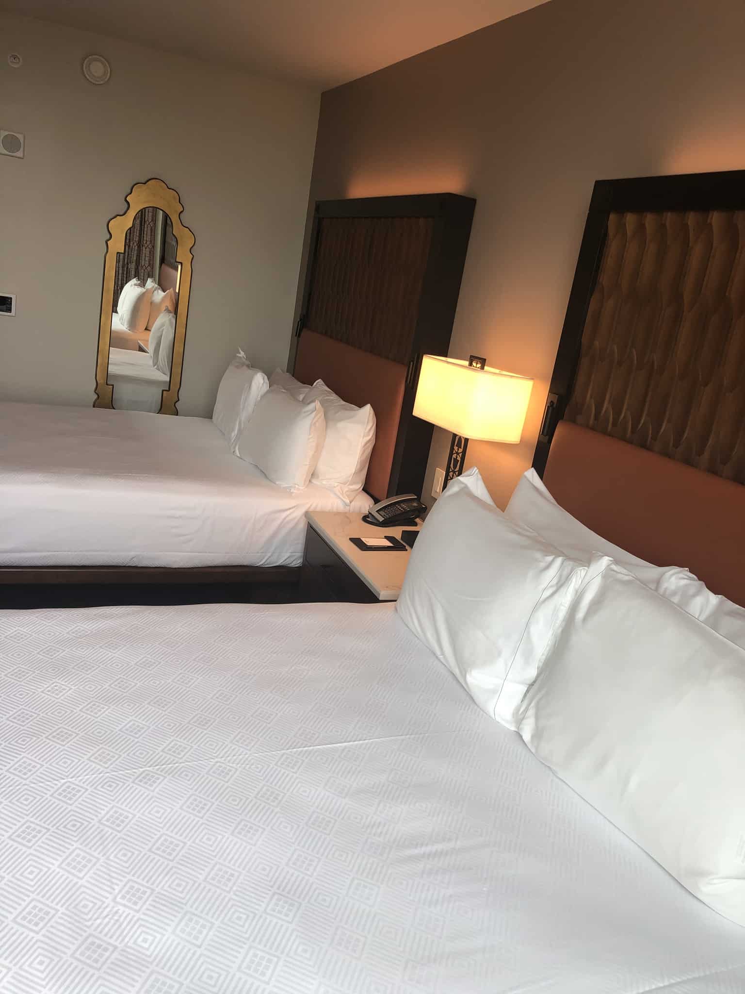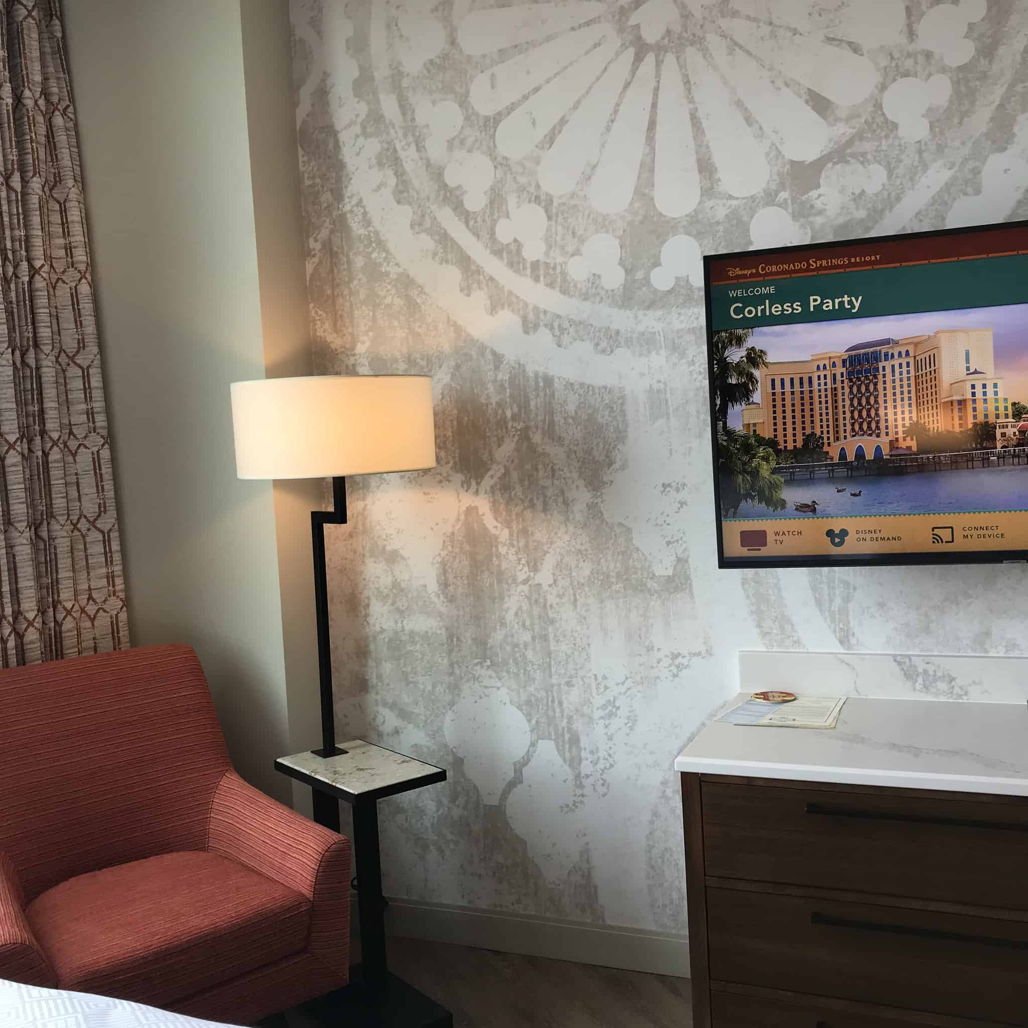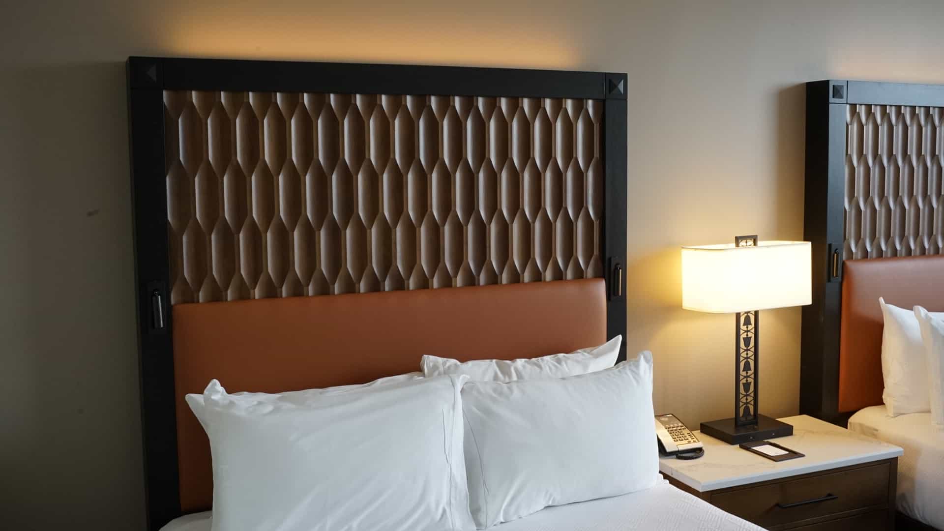 If you’re familiar with the rooms throughout Disney’s Coronado Springs, these more or less follow the same formula. You have two queen beds, with headboards that have built-in reading lamps on each side. No runners and no decorative pillows here.
