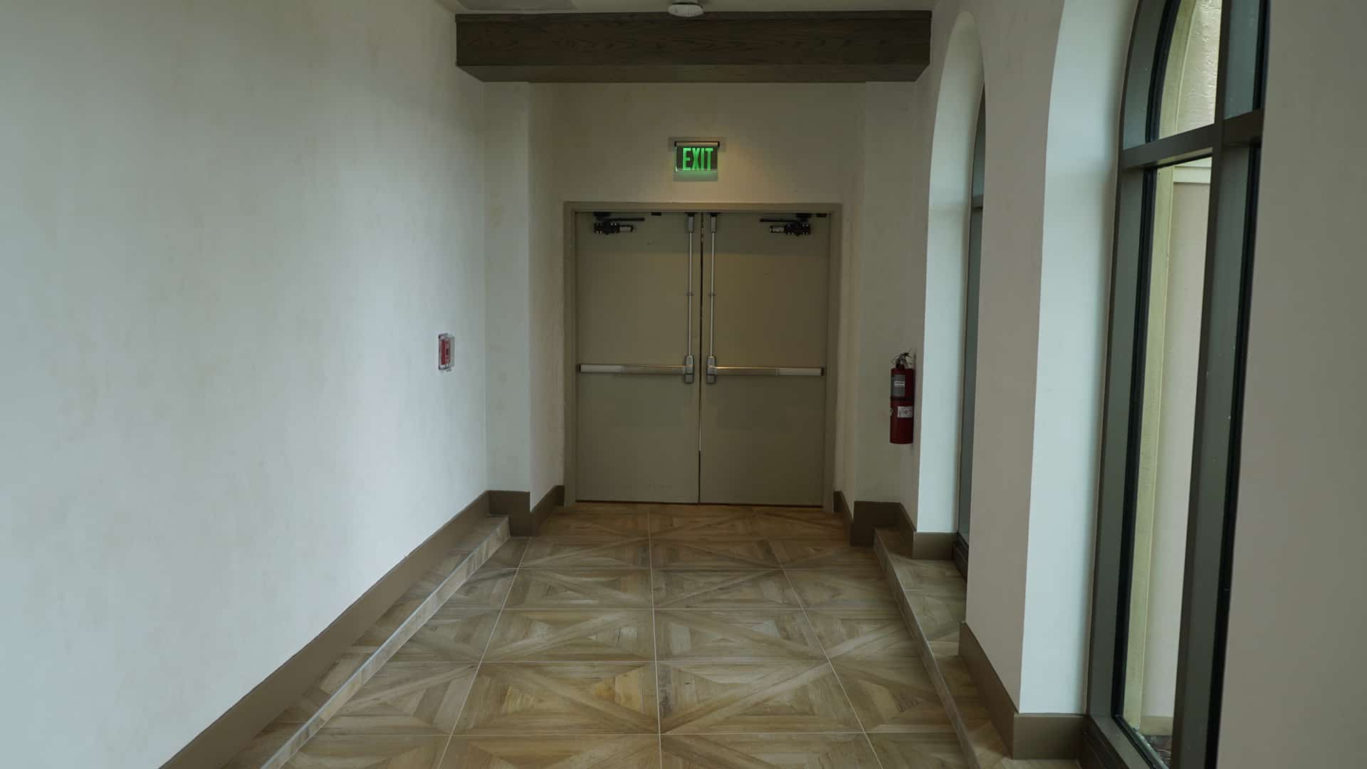 You follow the hallway to a set of nondescript, hopefully temporary doors.