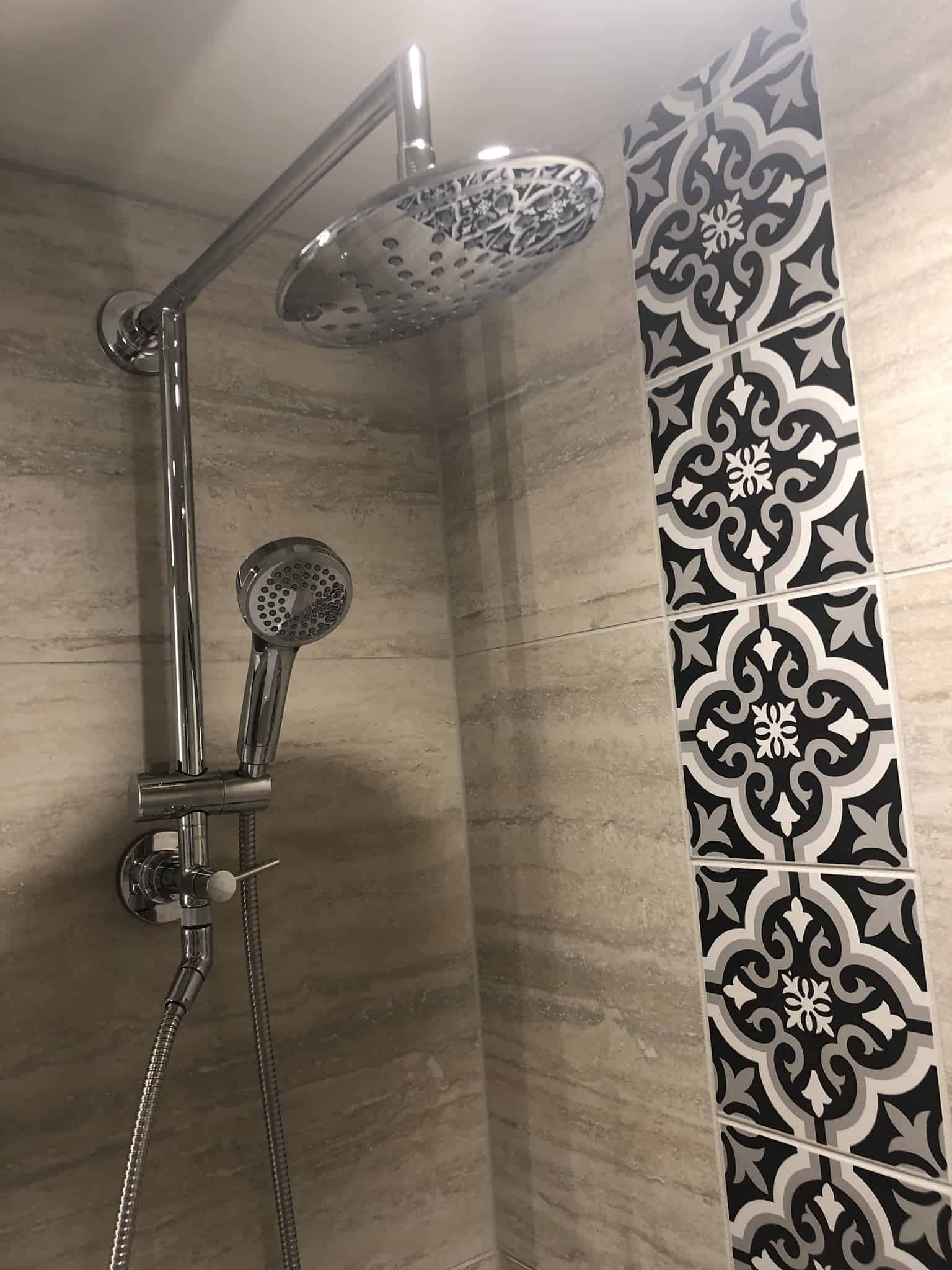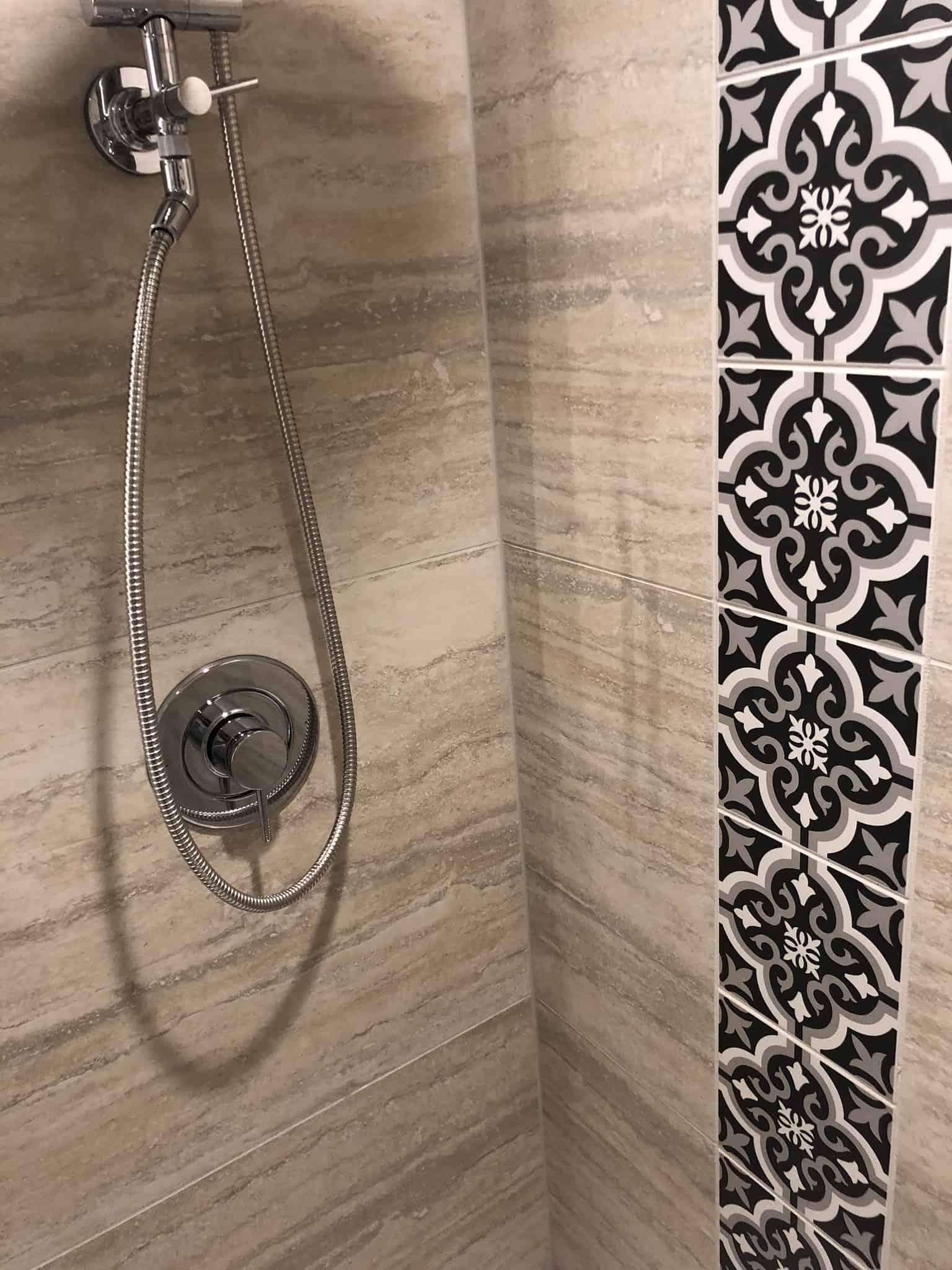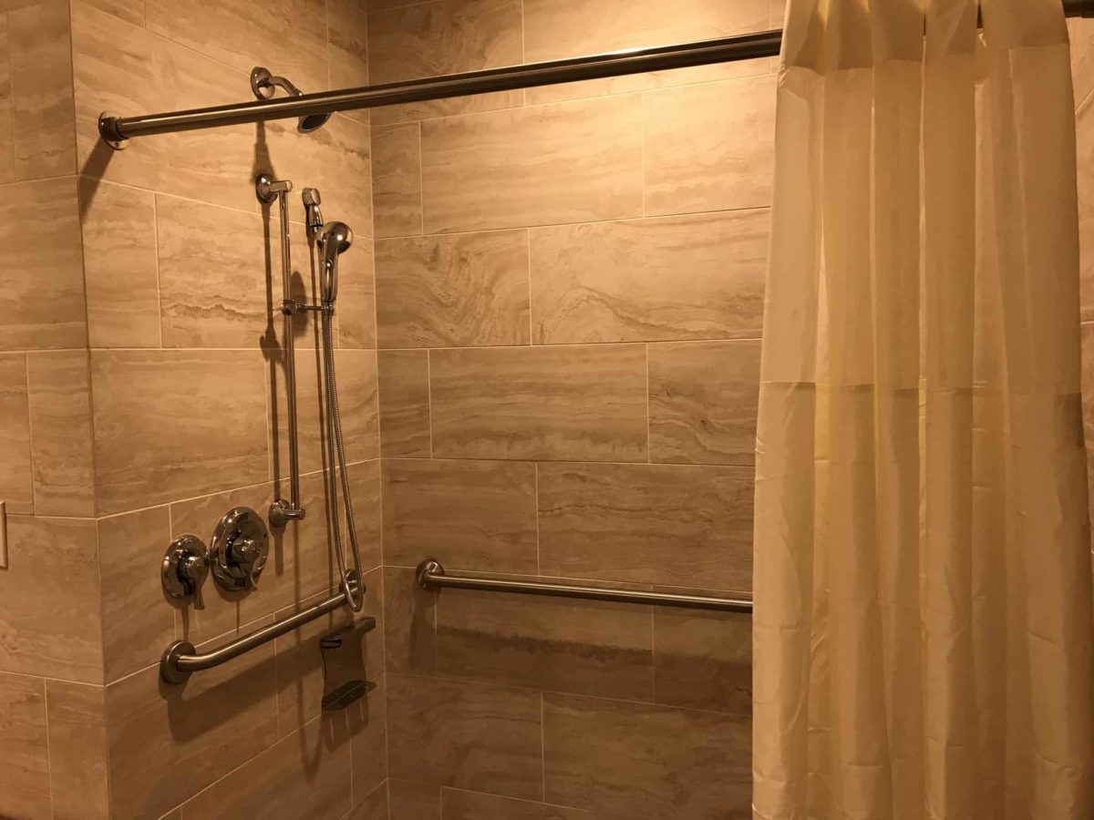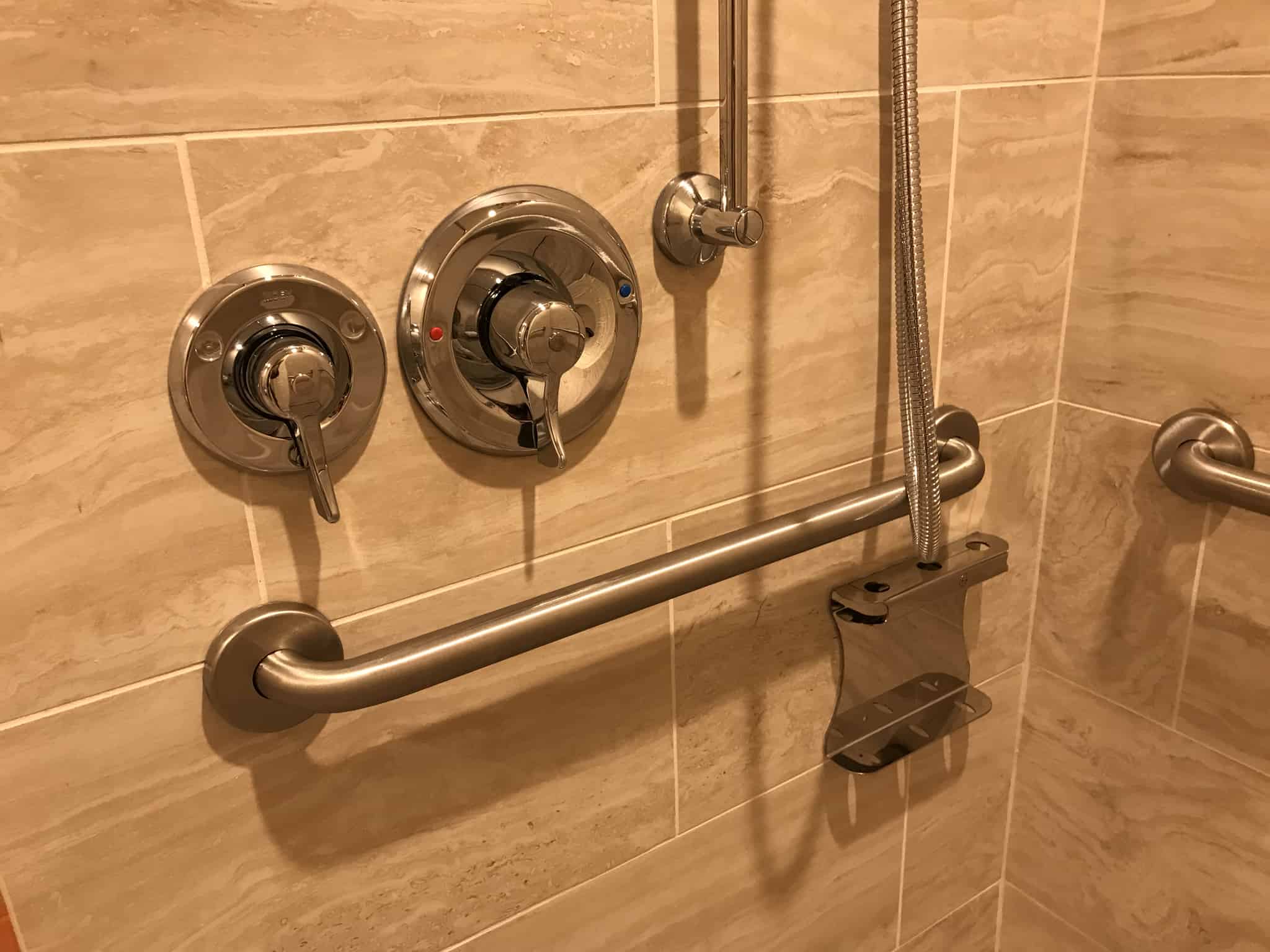 The accessible shower features a handheld showerhead and a standard wall showerhead.