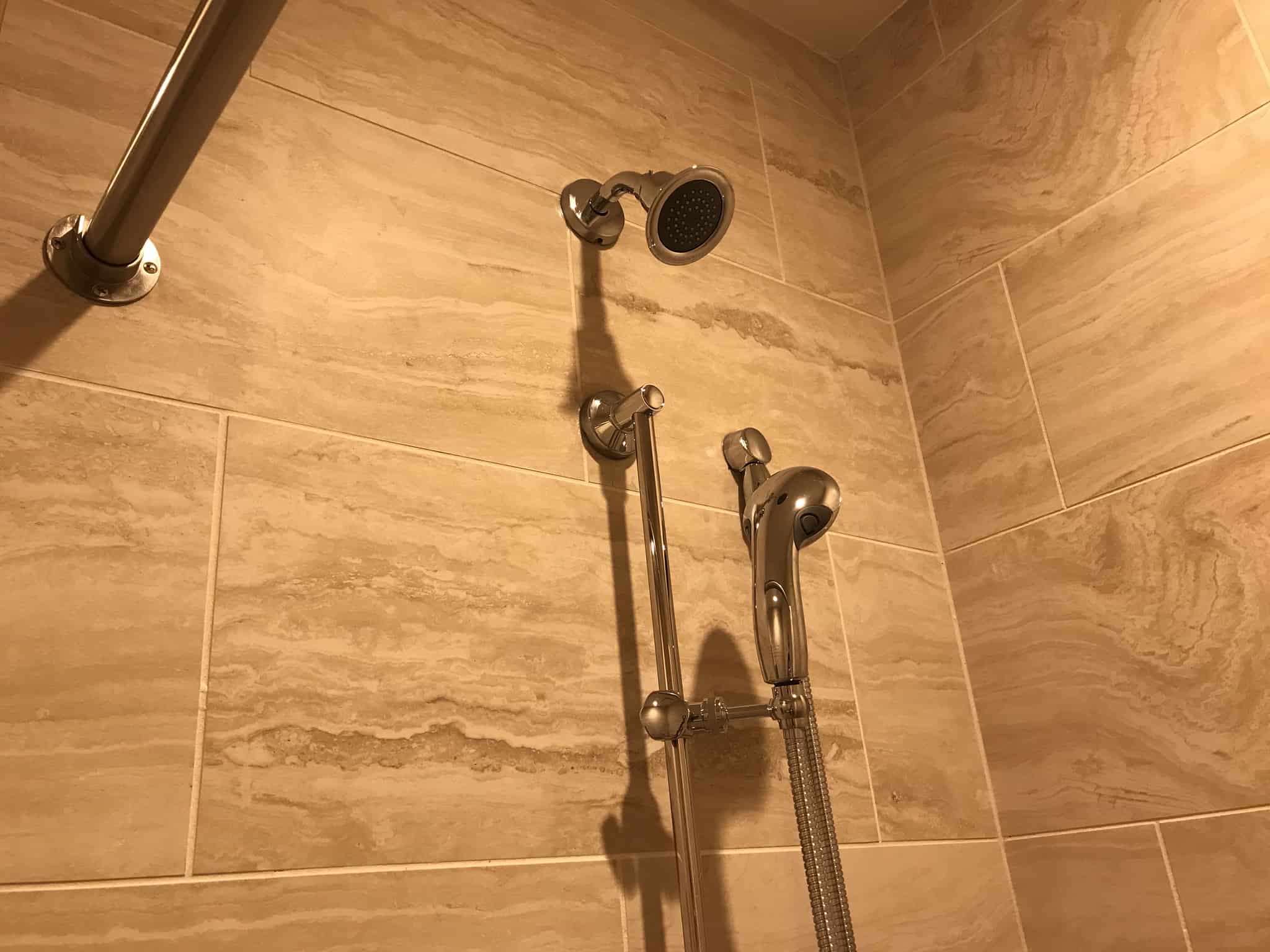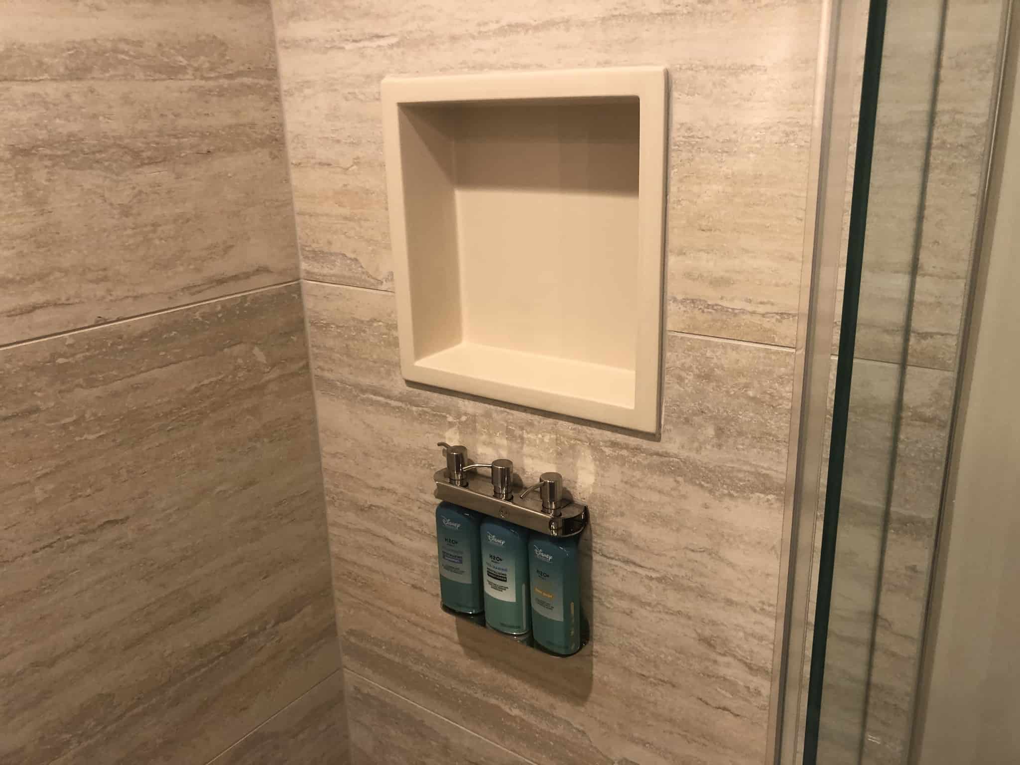 A small shelf for toiletries and a set of shampoo, conditioner, and body wash pumps are mounted onto the wall. Despite outcry against these refillable pump bottles over the years, they’ve really grown on me, as they’re handy to have. My one gripe about the shower is the lack of a shaving ledge for the ladies, (or anyone who happens to shave their legs.)