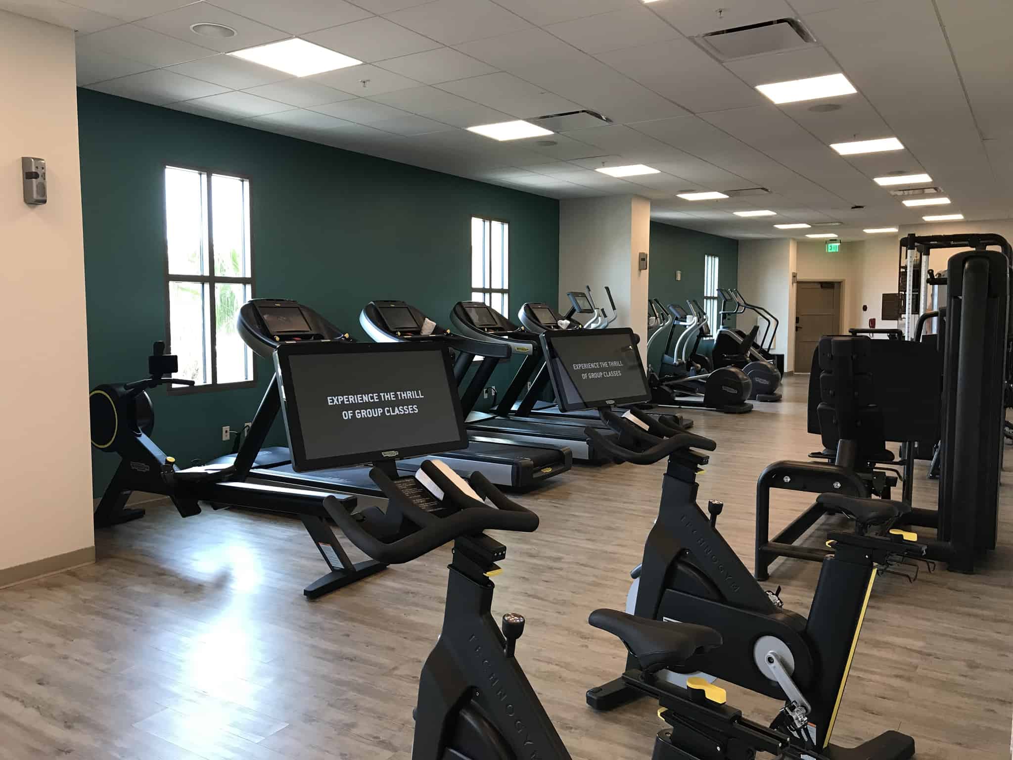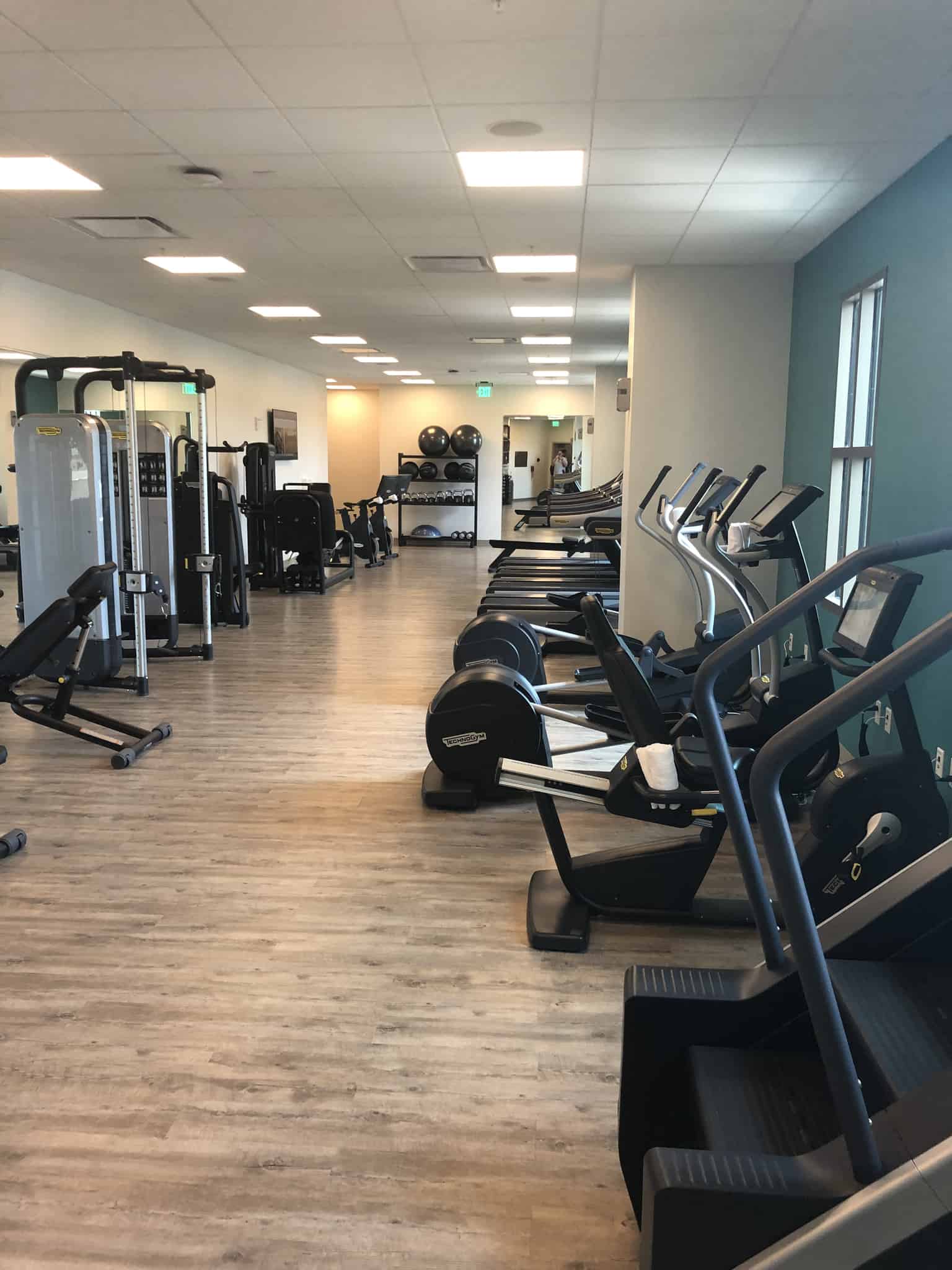 A variety of exercise machines, free weights, and exercise mats are available for use.