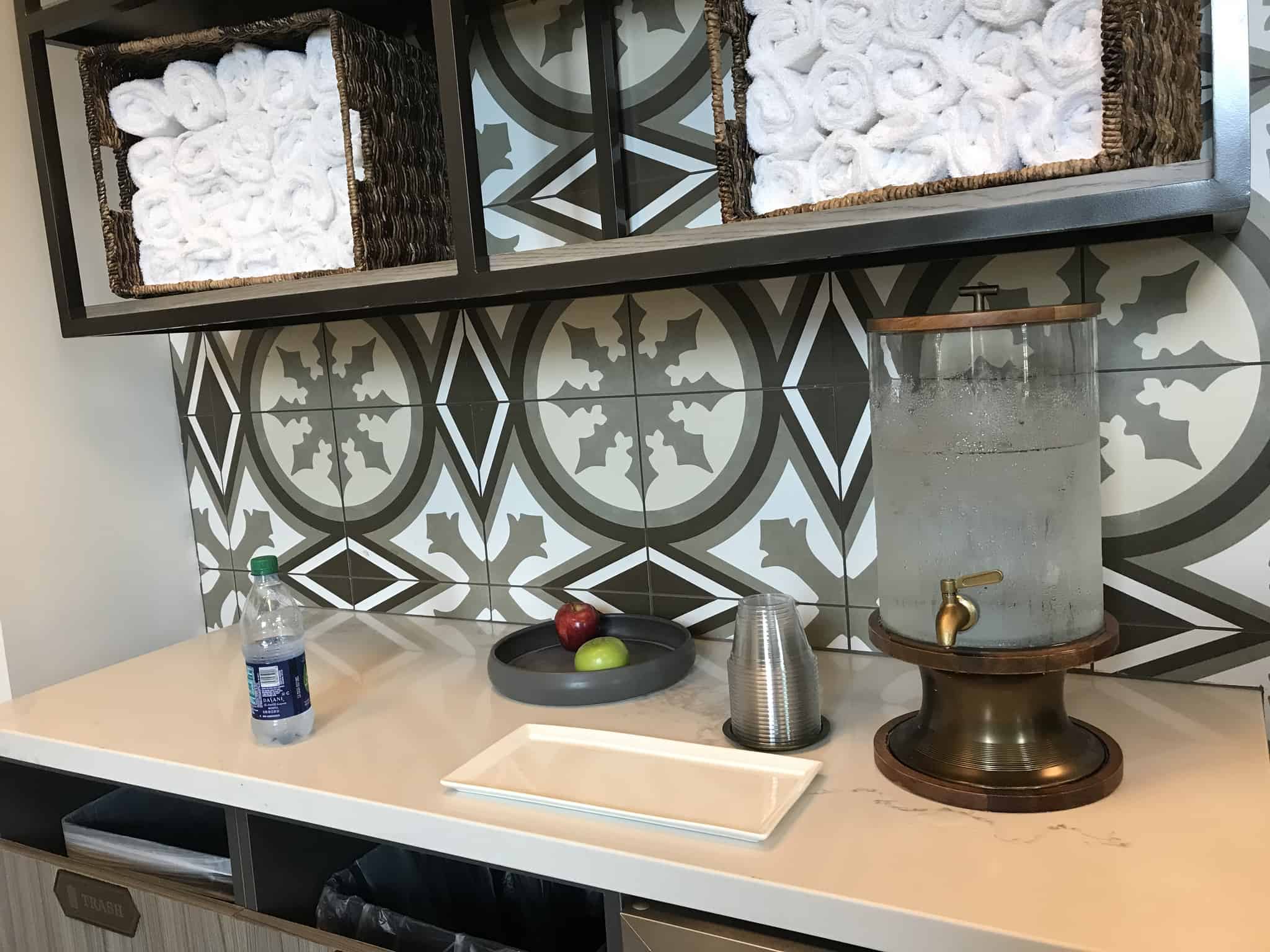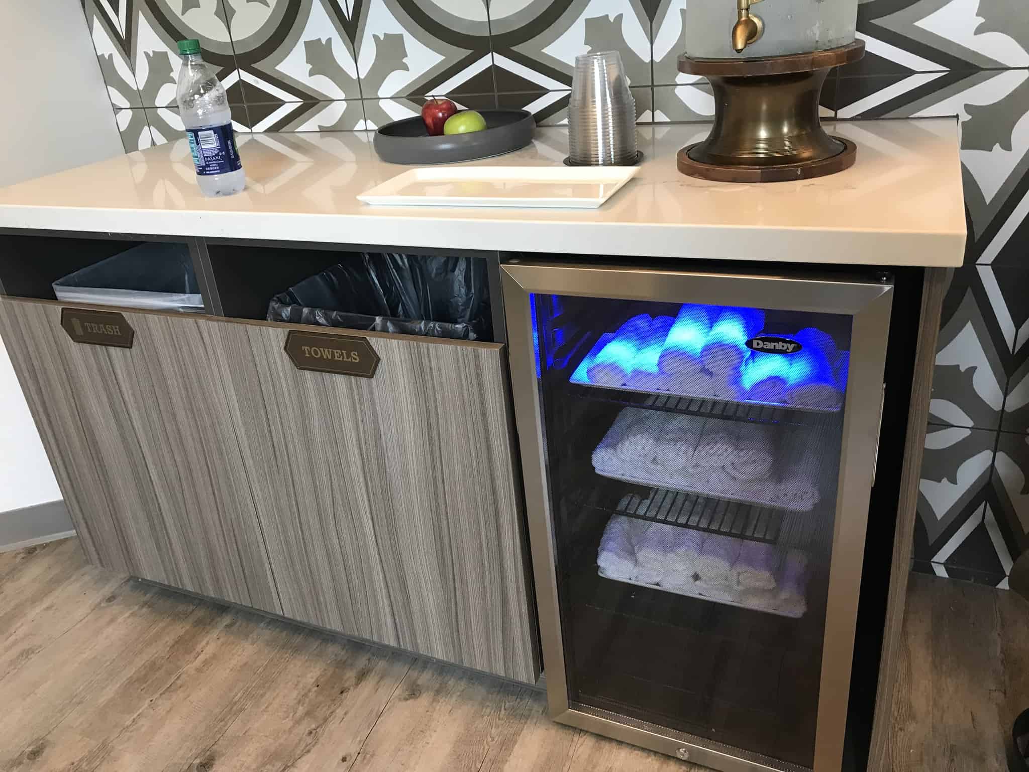 As you walk in, there’s a station with gym towels, fancy pre-soaked and chilled washtowels, and complimentary fruit and ice water.