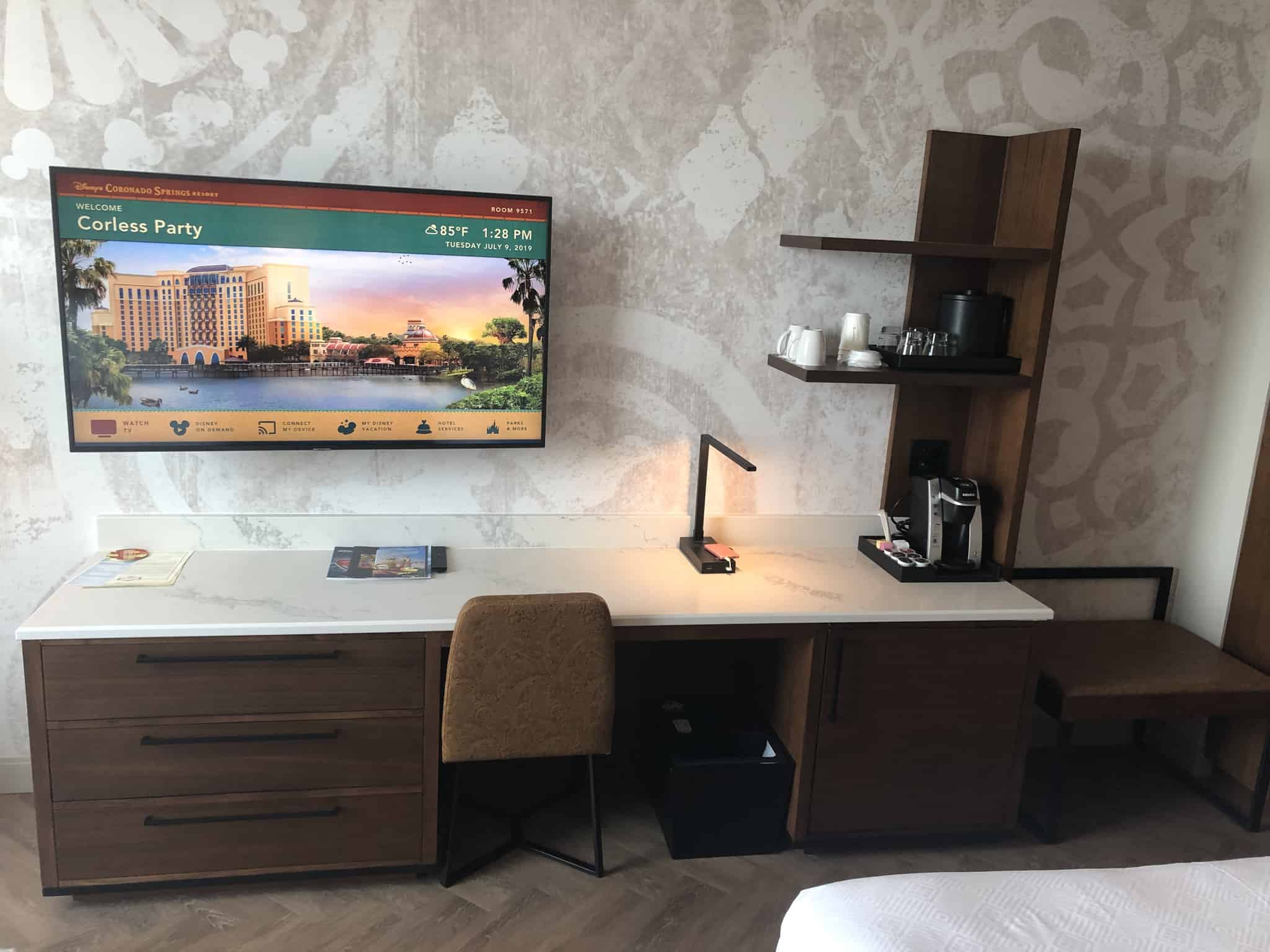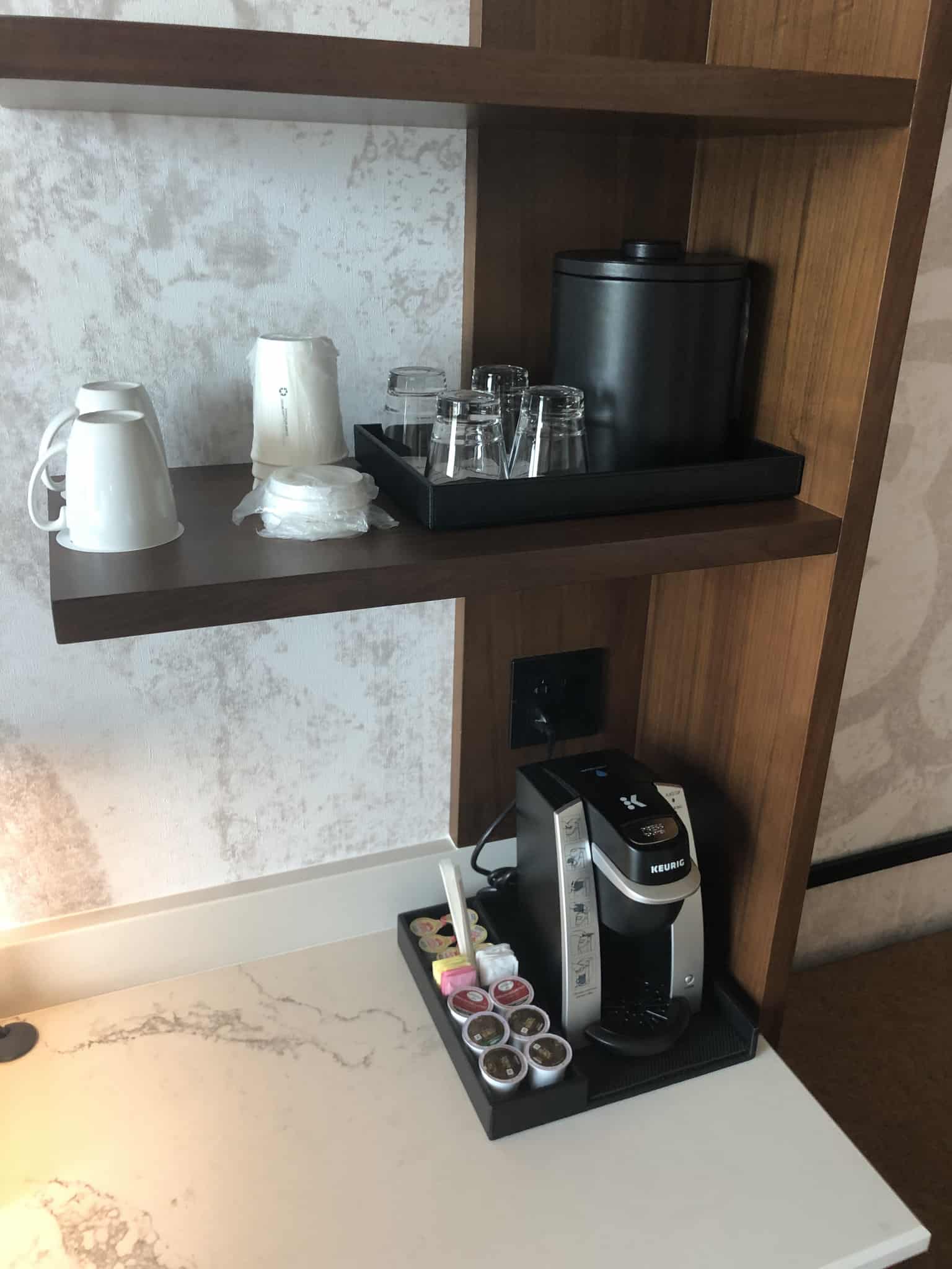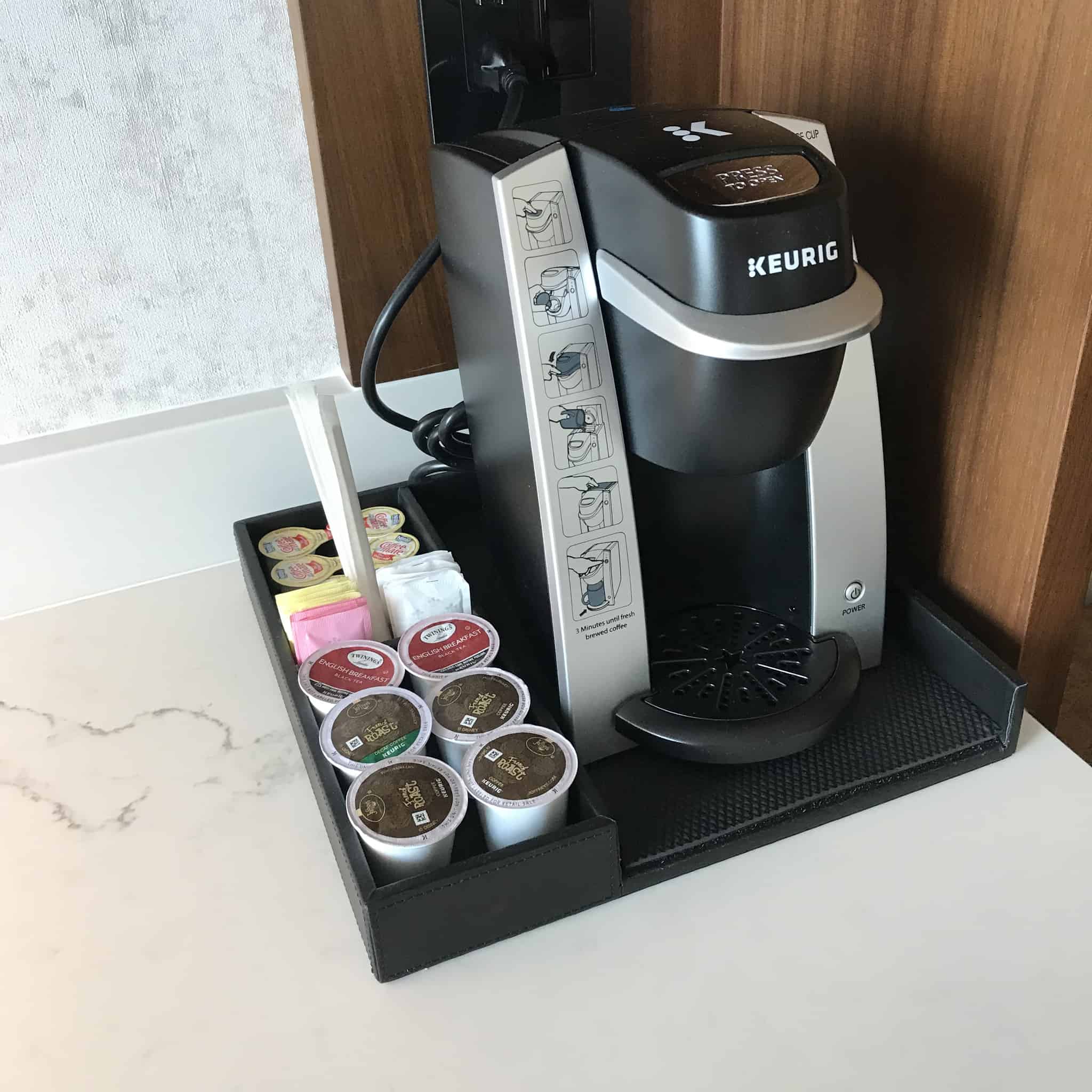 Unlike the remodeled rooms currently testing at Disney’s Wilderness Lodge (a Deluxe resort, mind you), Keurigs come standard at all rooms at Disney’s Coronado Springs Resort, Tower room or otherwise. A selection of Joffrey’s Coffee K-cups, including regular, decaf, and some Twinings English Breakfast tea pods are available, plus creamer, sugar, and all the fixings, plus ceramic and paper travel mugs.