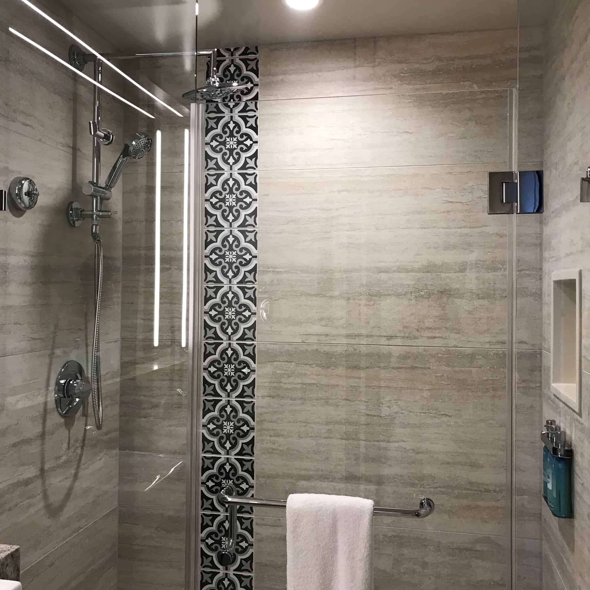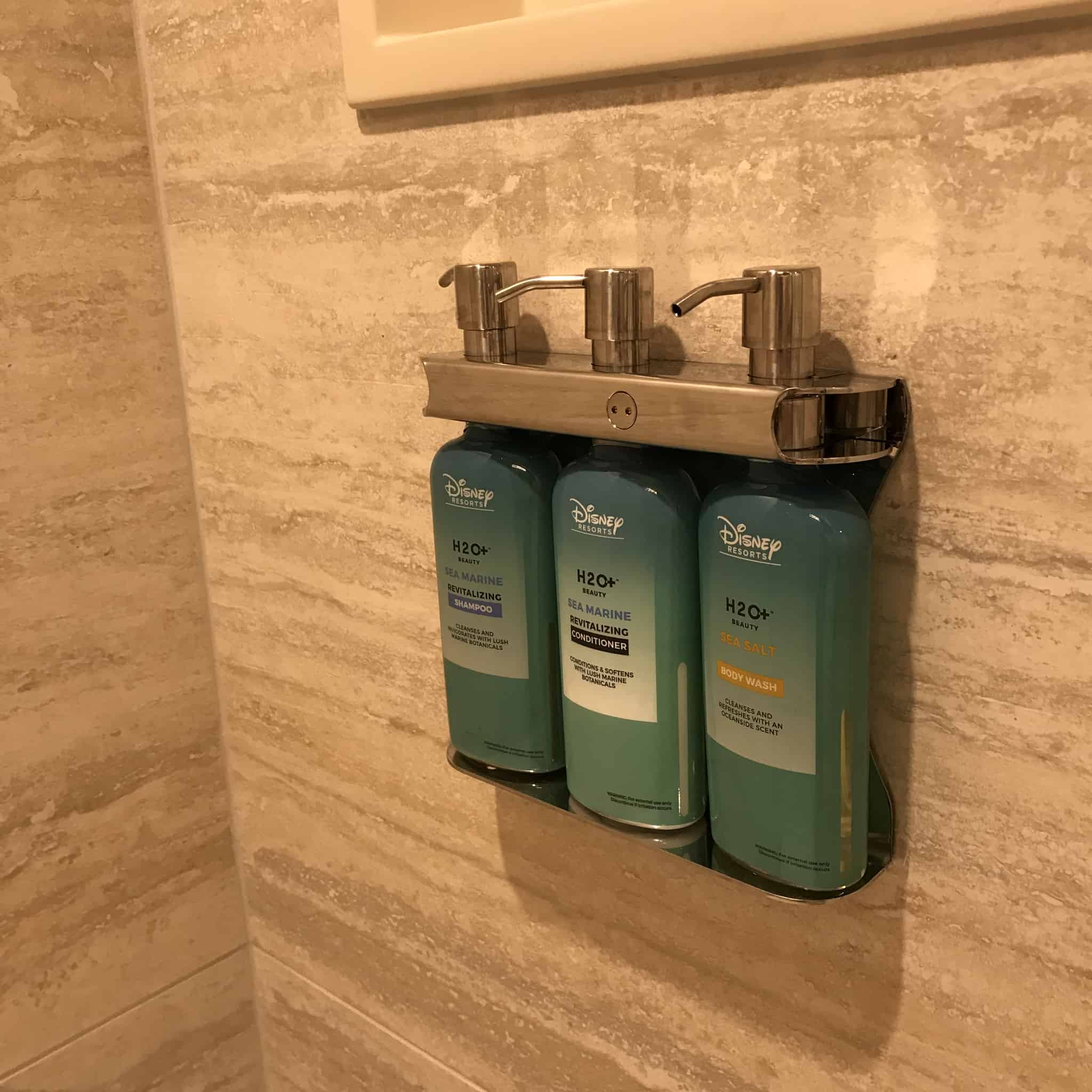 The shower should be outfitted with refillable H2O shampoo, conditioner, and body wash pumps, as seen by the wall caddy.