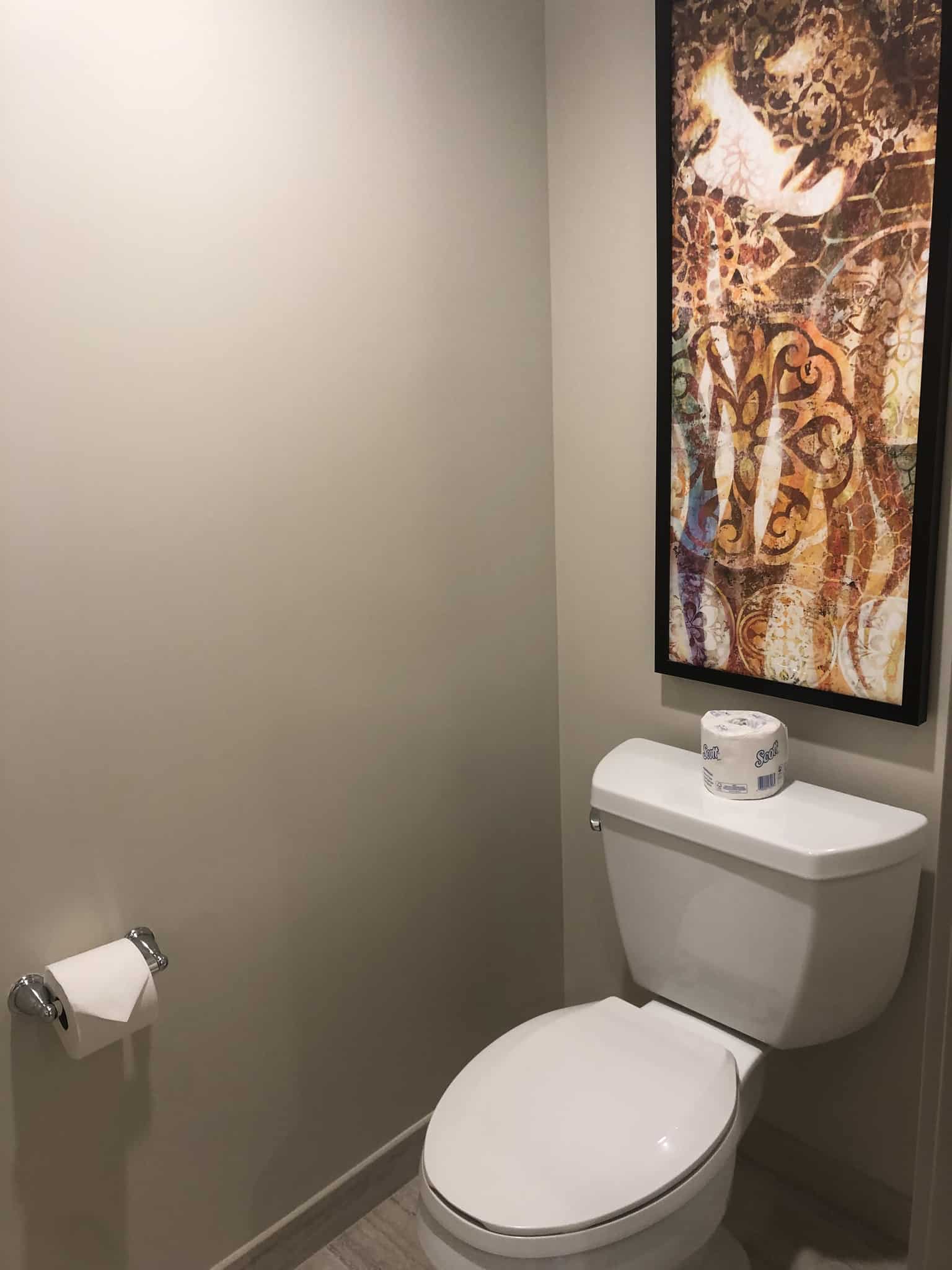 The toilet is tucked away into its own little room, complete with a sliding door. The sole piece of artwork in the entire room hangs behind the toilet.