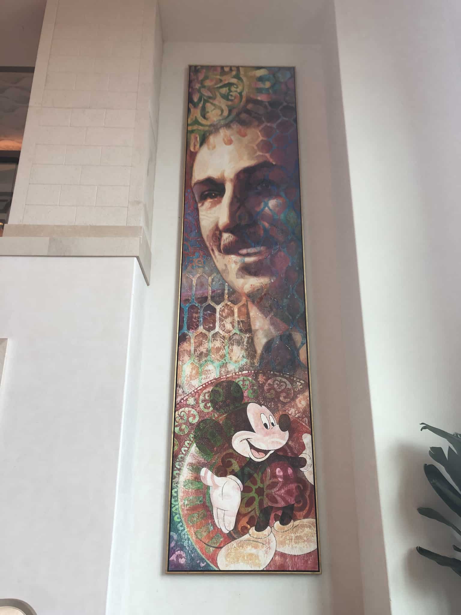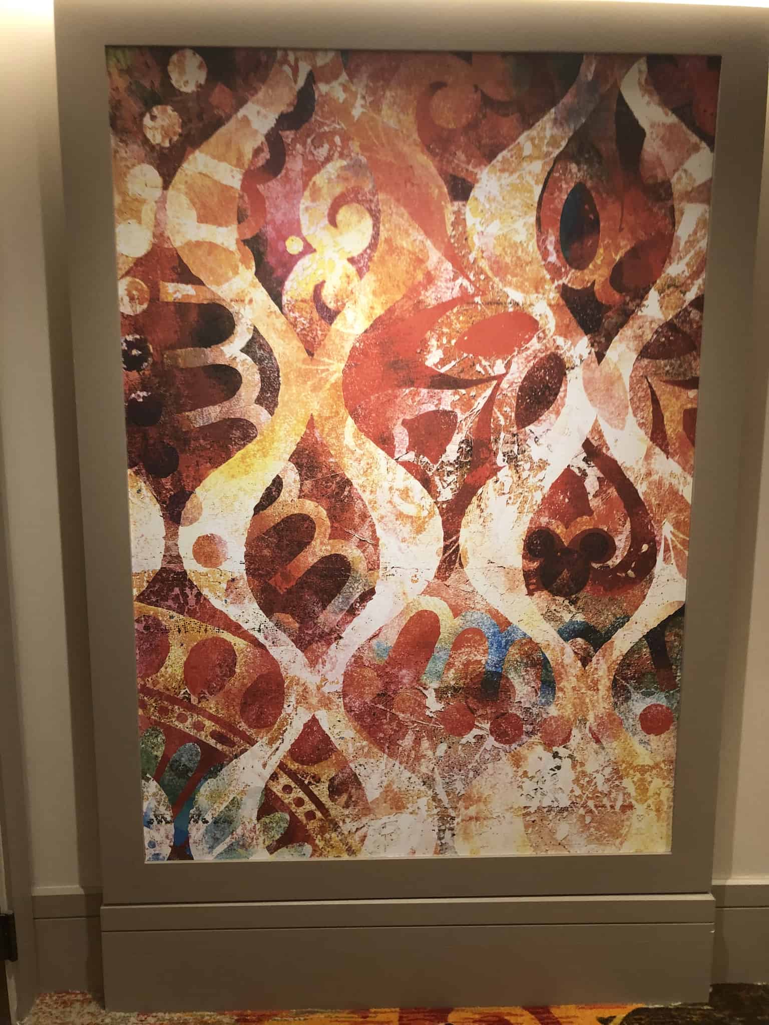 Once you arrive at your desired floor, you’re welcomed by bright carpets with orange, pink, and yellow designs (and of course, hidden Mickeys) as well as wall art lining the halls.