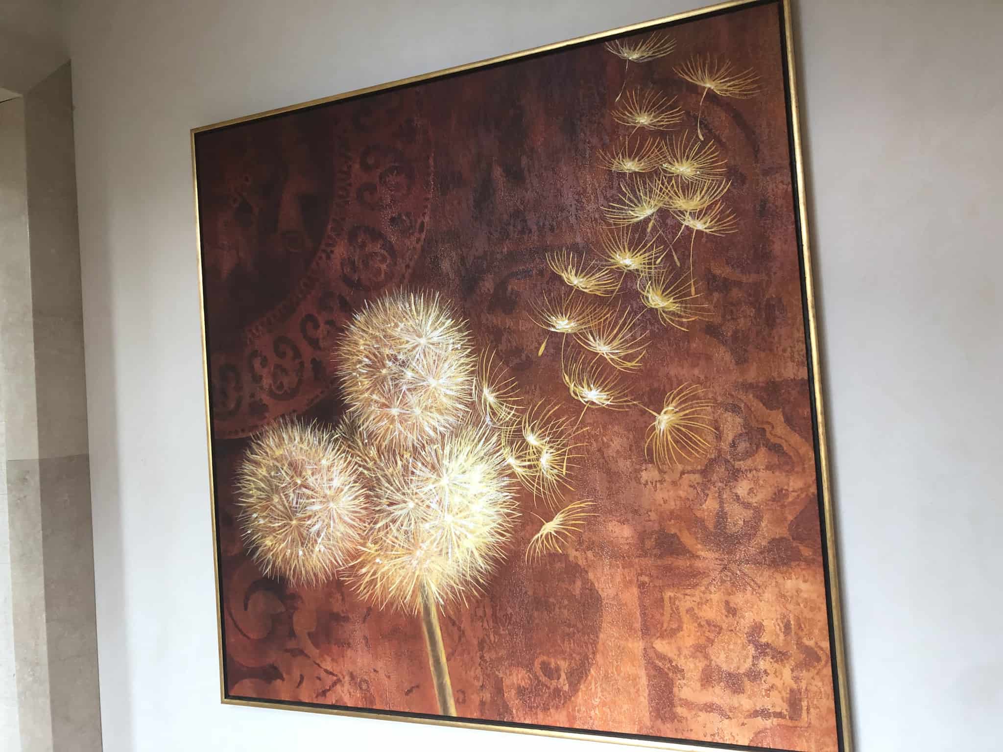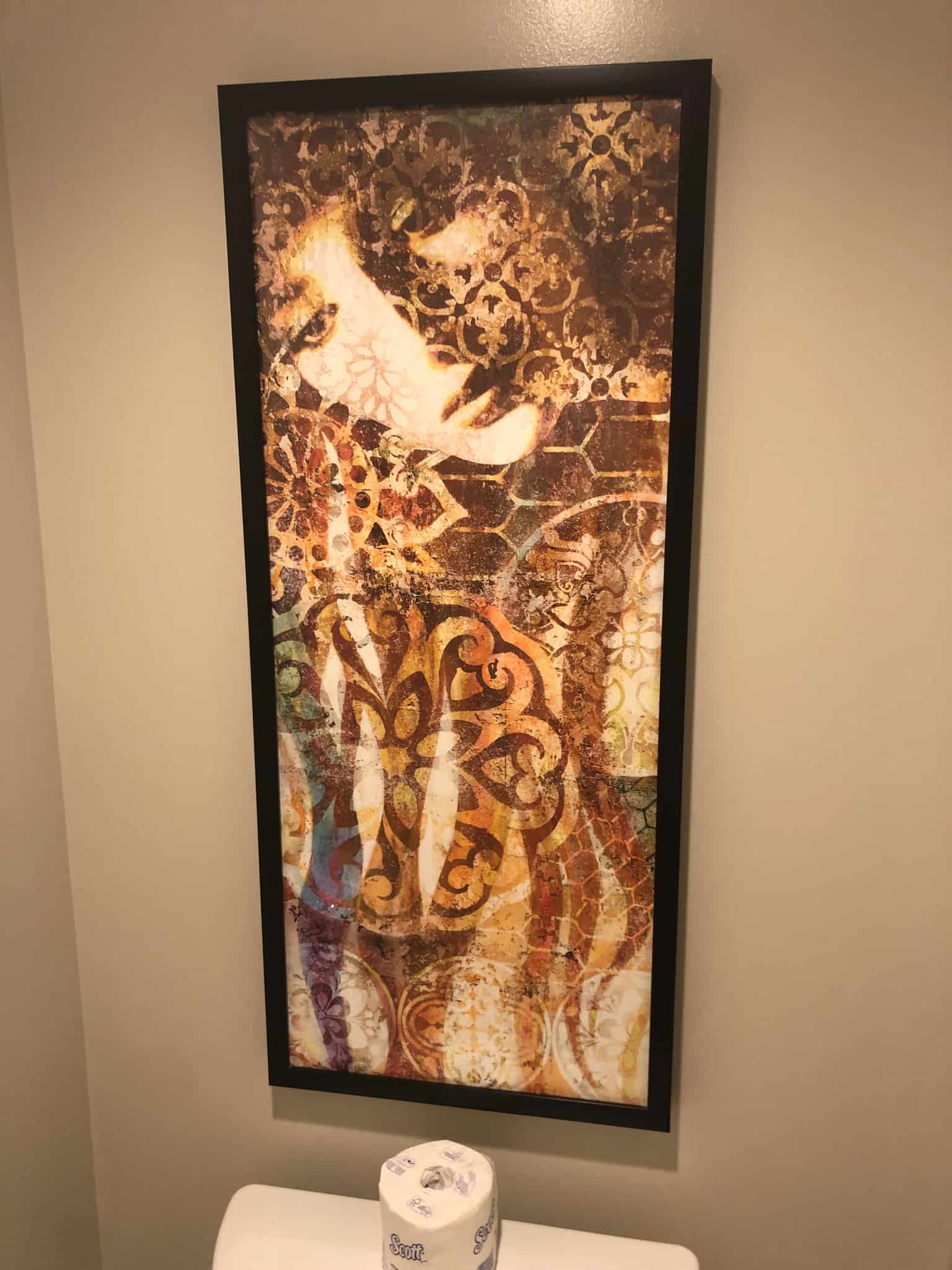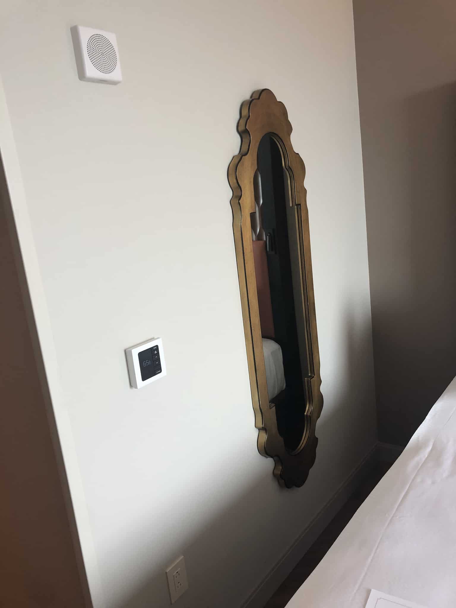 You have one foot of clearance between the wall and the bed, basically. They could’ve placed this over by the foyer area right by the entrance to the room, or hung a piece of horizontal artwork instead.
