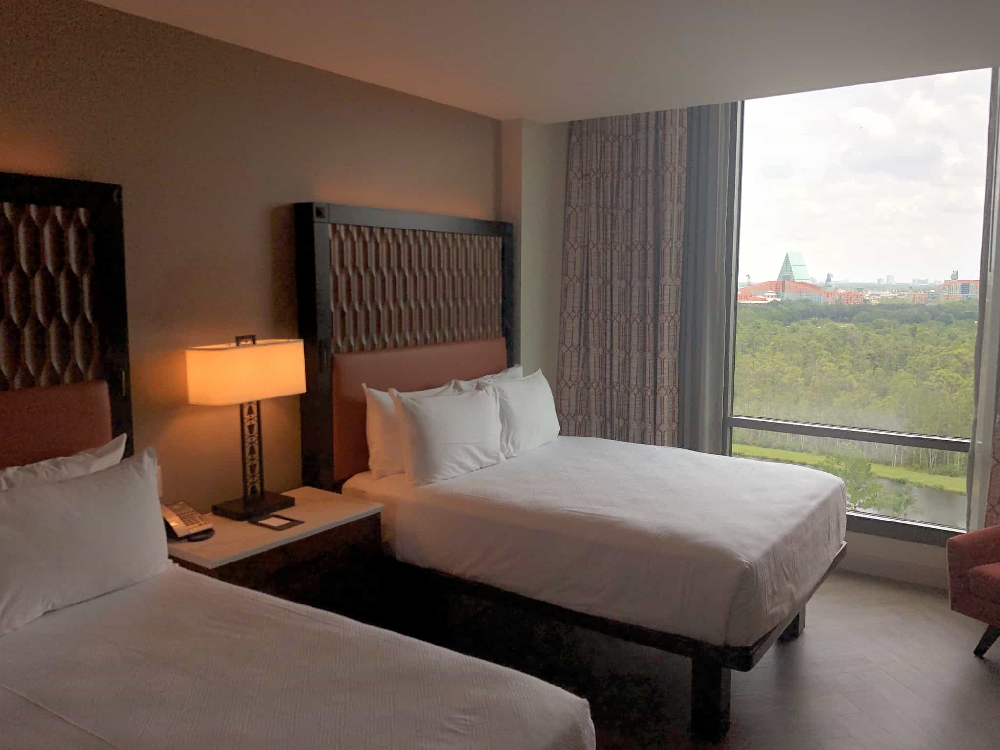 Long, indoor hallways (thankfully not Kidani Village long) are capped by windows offering full panoramic views of the four parks, as well as views of the rest of the resort. In our section, we could see Space Mountain and the rest of the Magic Kingdom off in the distance in the hall window, plus views of Epcot and Disney’s Hollywood Studios inside our room. Which leads us to the main part of the review…