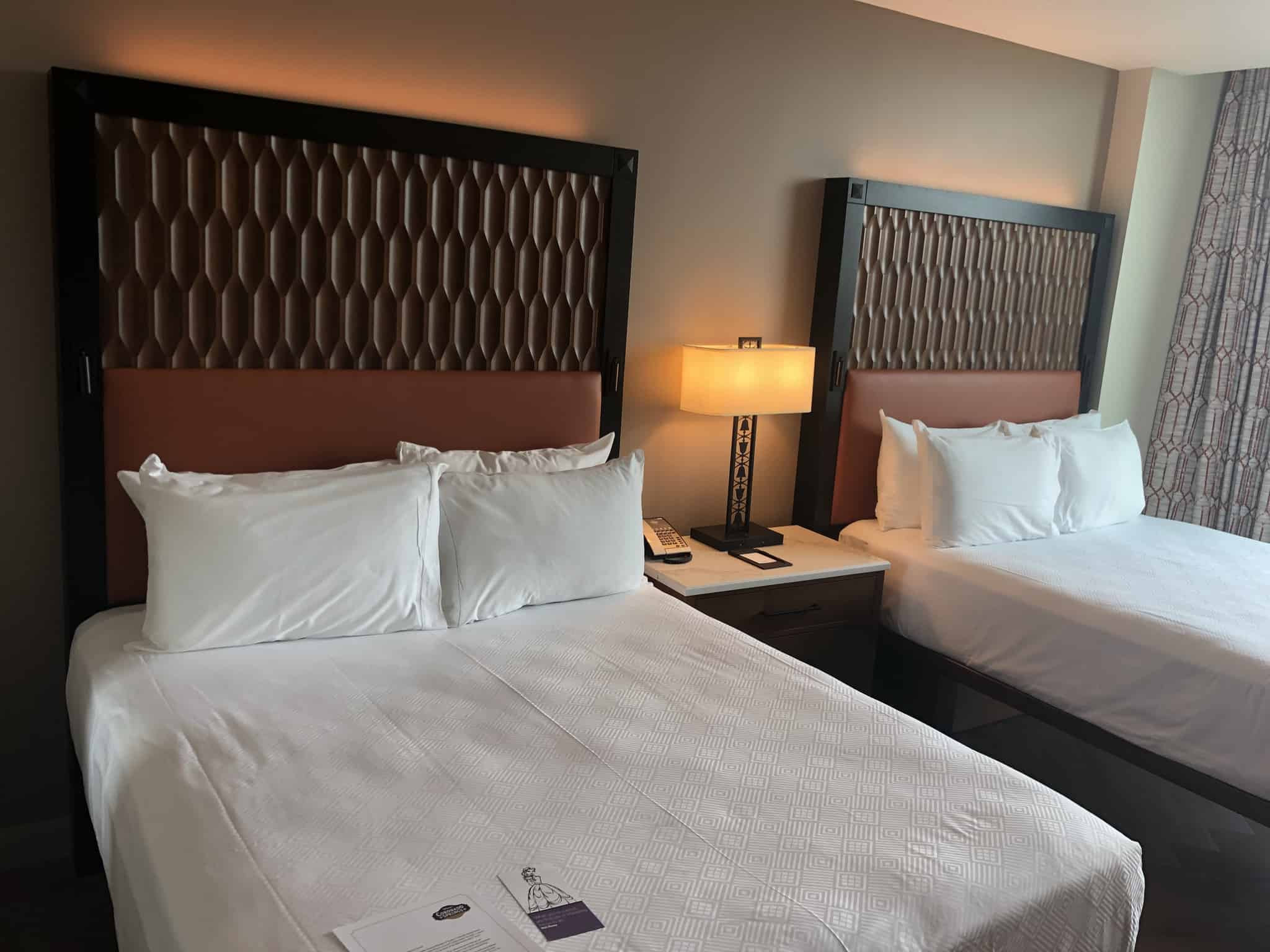 There’s space underneath the beds for luggage and storage, as well as a middle nightstand with drawers, an in-room phone, and a lamp with built-in USB ports.