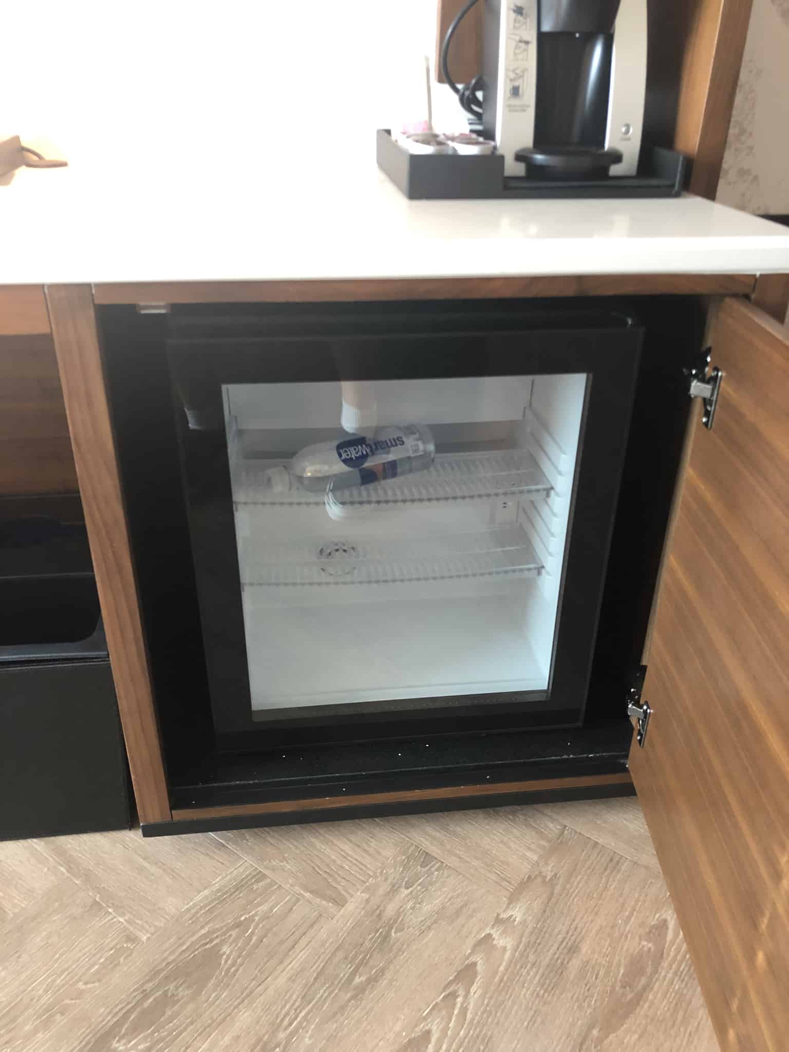 A glass door mini fridge is stored below. (Shown here with a bottle of water for scale.)