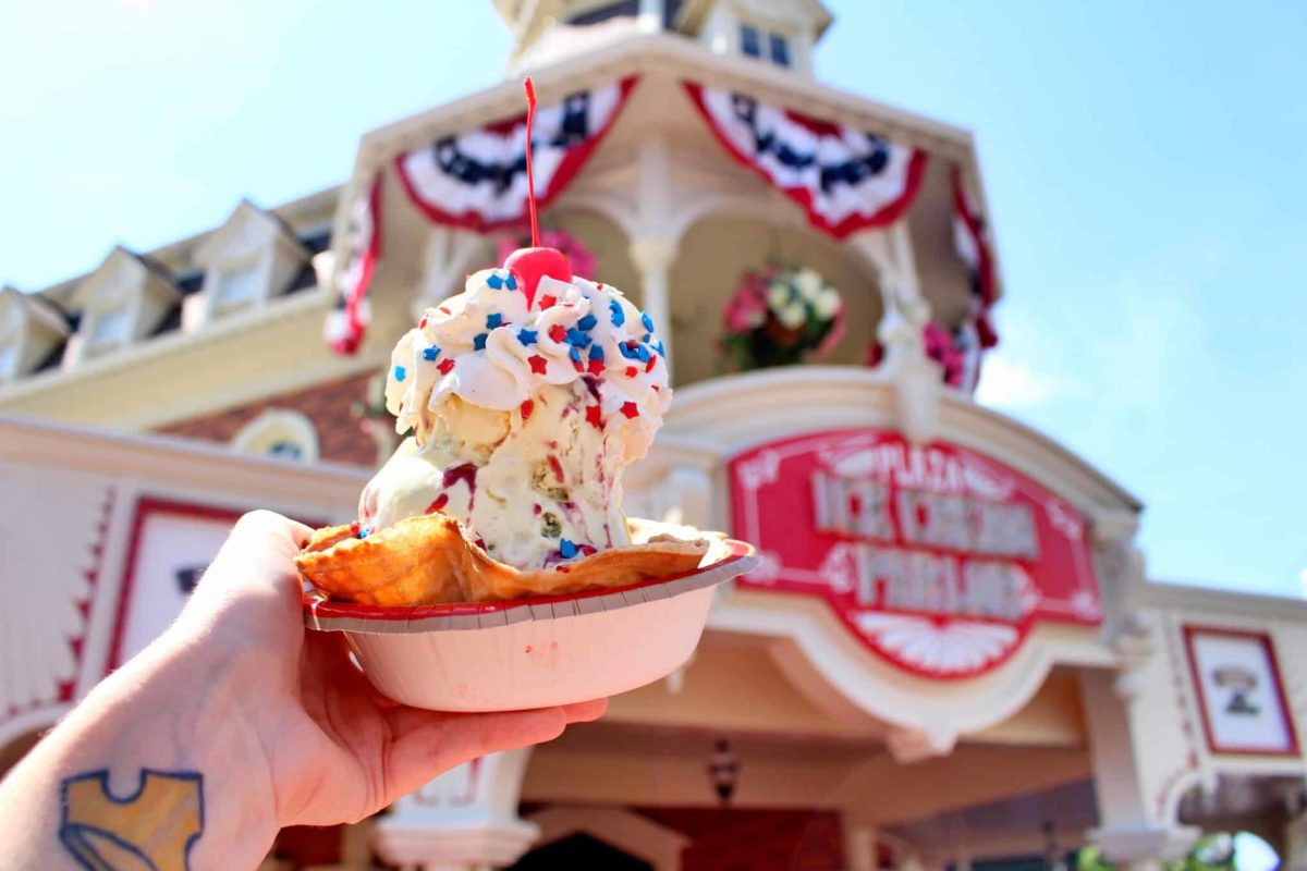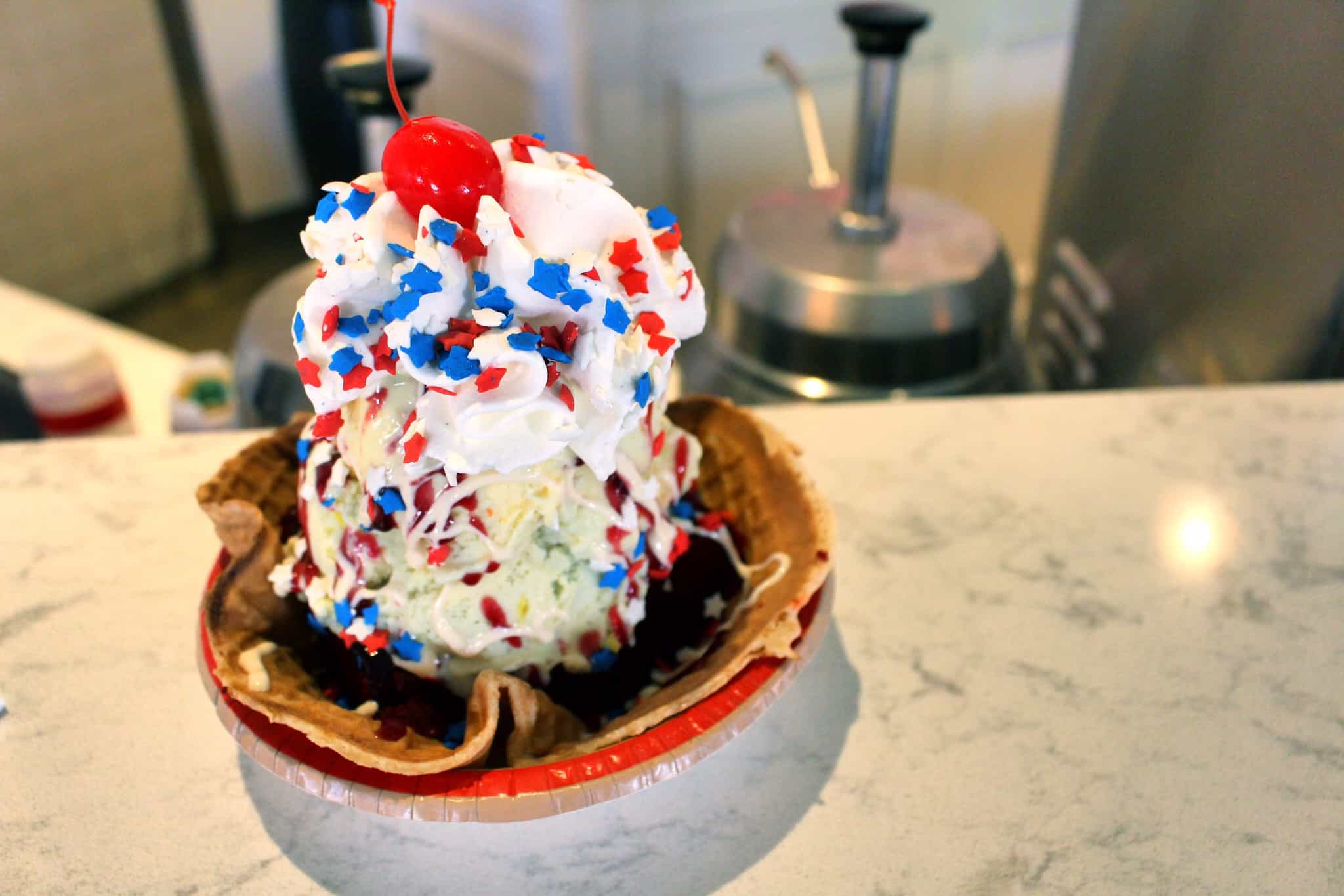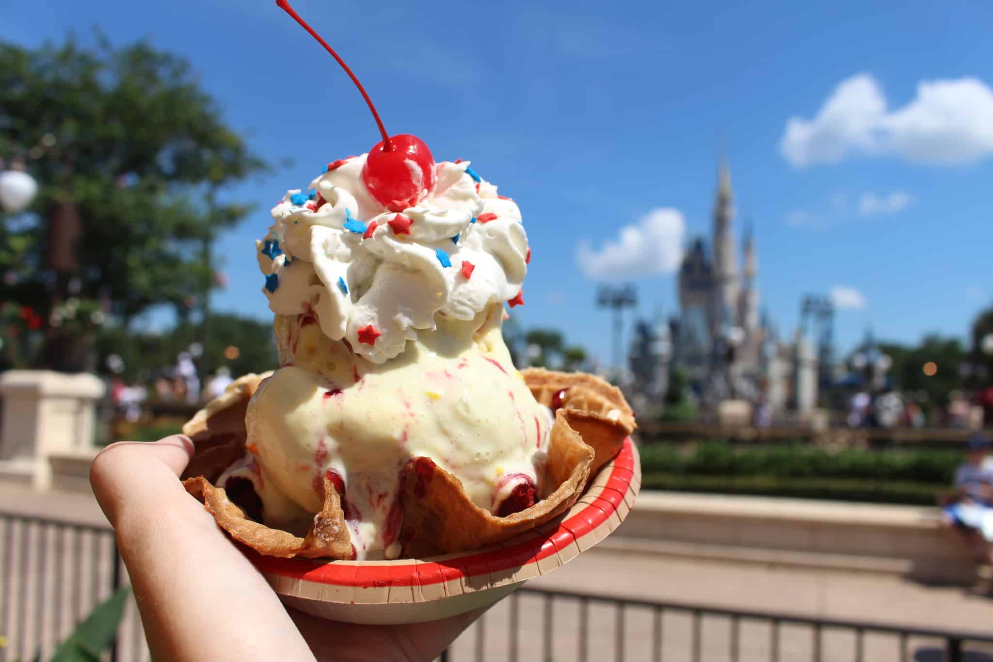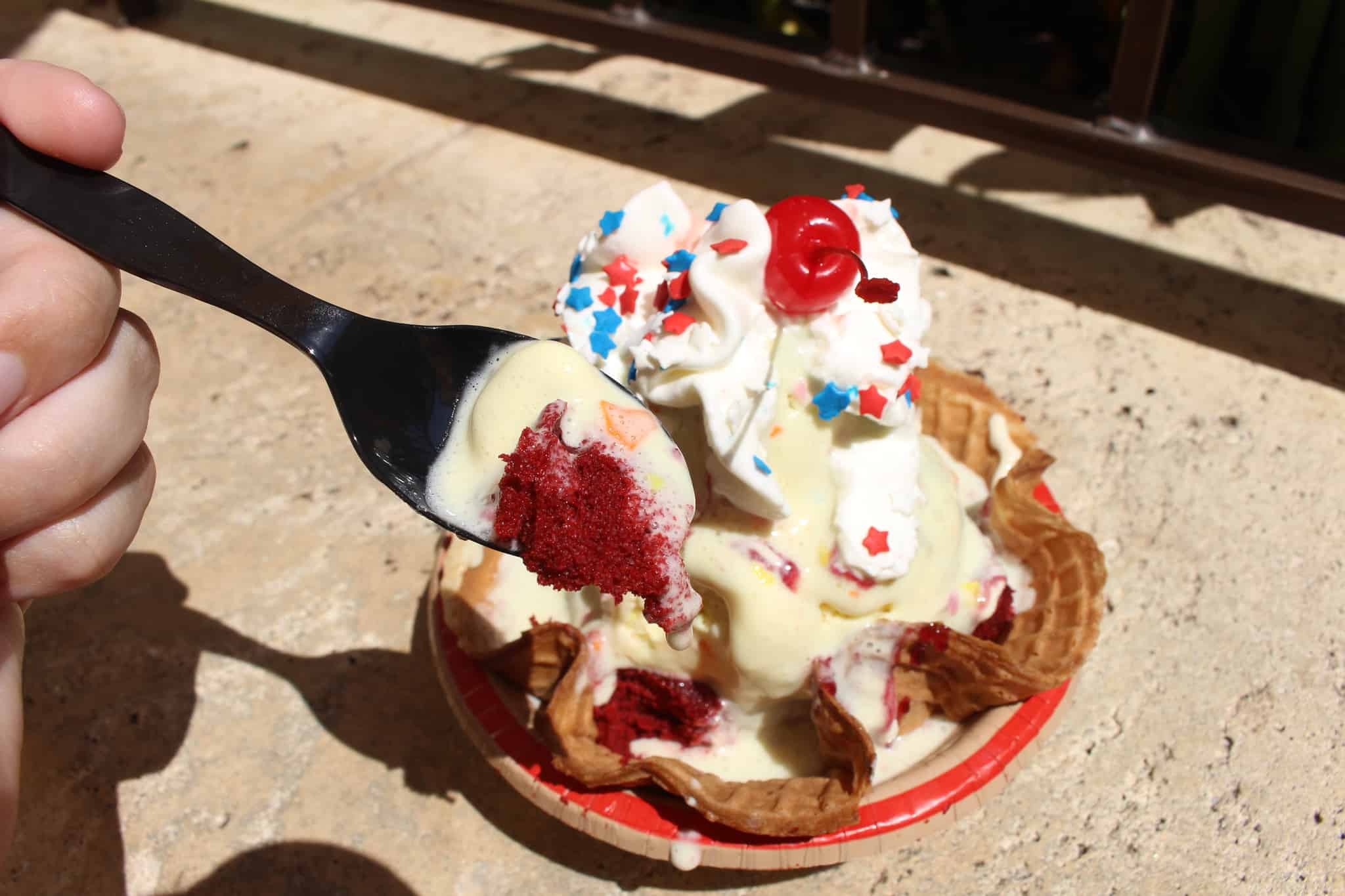 Disney describes the sundae as red velvet cake topped with birthday cake ice cream, vanilla sauce, raspberry sauce, whipped cream, a cherry, and red, white, and blue sprinkles. The whole ensemble is served inside a waffle bowl for $7.99.