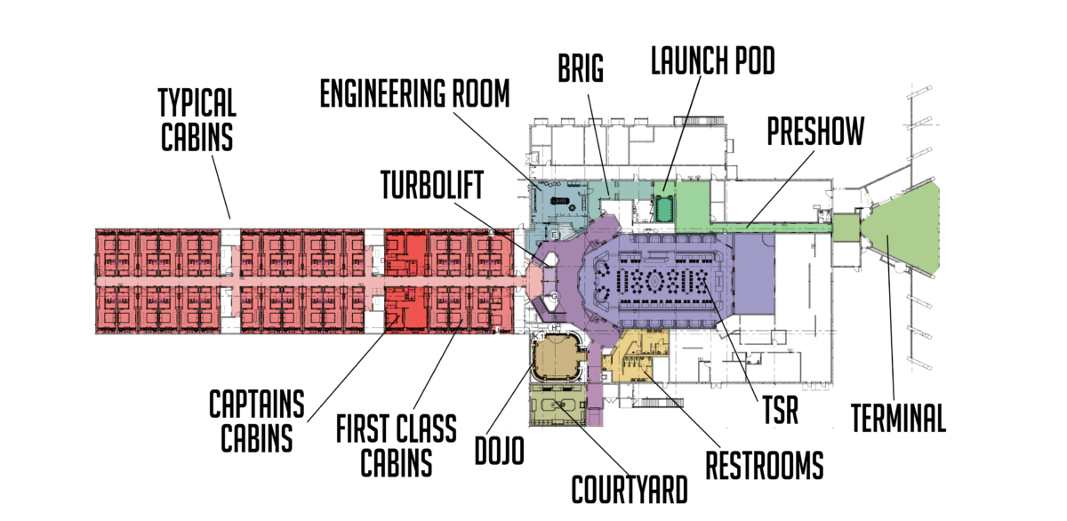 Guests arrive from the Launch Pod on the next level up, arriving in the lobby (in pink). This floor includes a Cantina, the bridge of the ship, a shop, restrooms, and more rooms (typical, captains, and first class varieties).