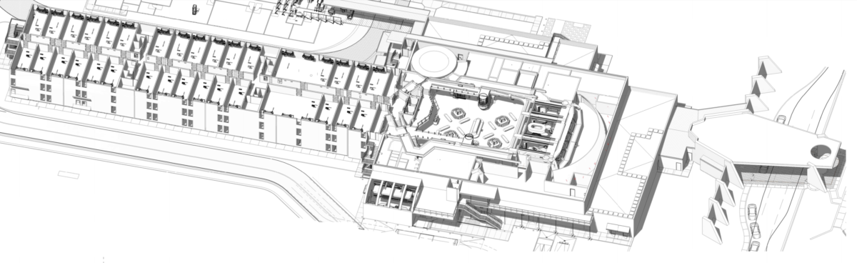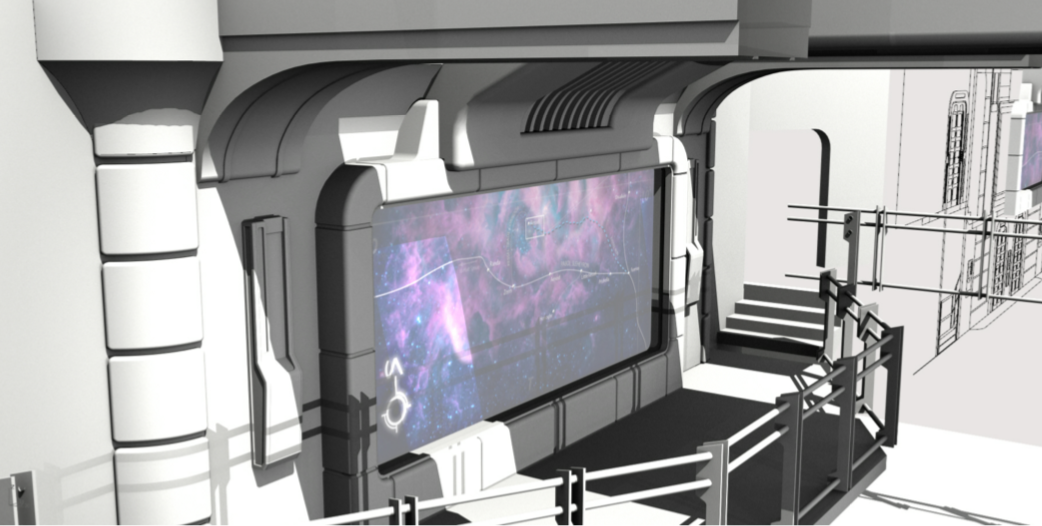 Here’s a 3-D model looking in from the top floor of the resort. Guests arrive to the right, go through security, take a launch pod to the interstellar space cruiser, and arrive in the lobby at center. Guest rooms are off to the left.