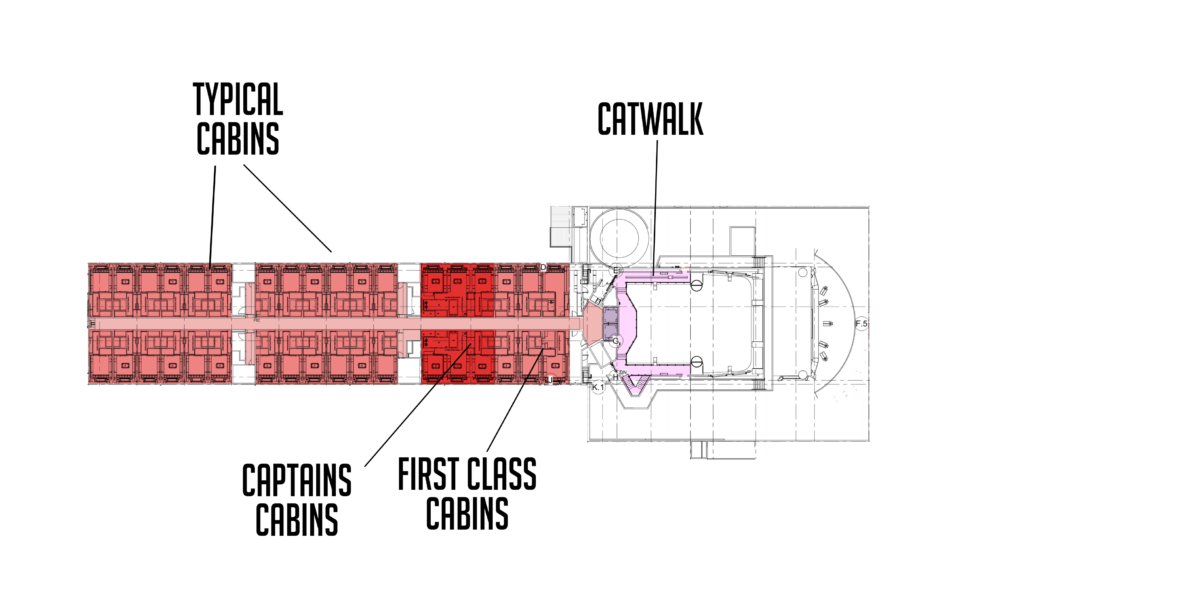 The top floor includes a catwalk and more cabins of the three class types.