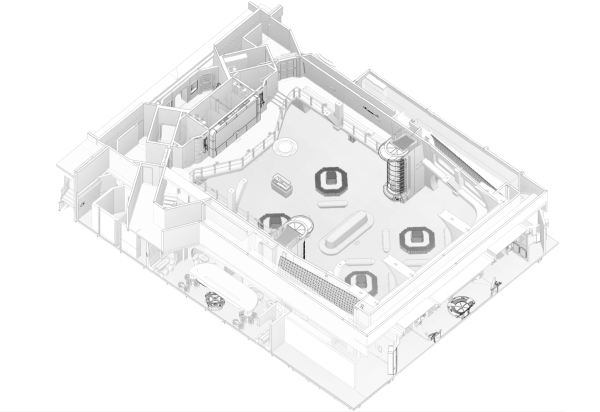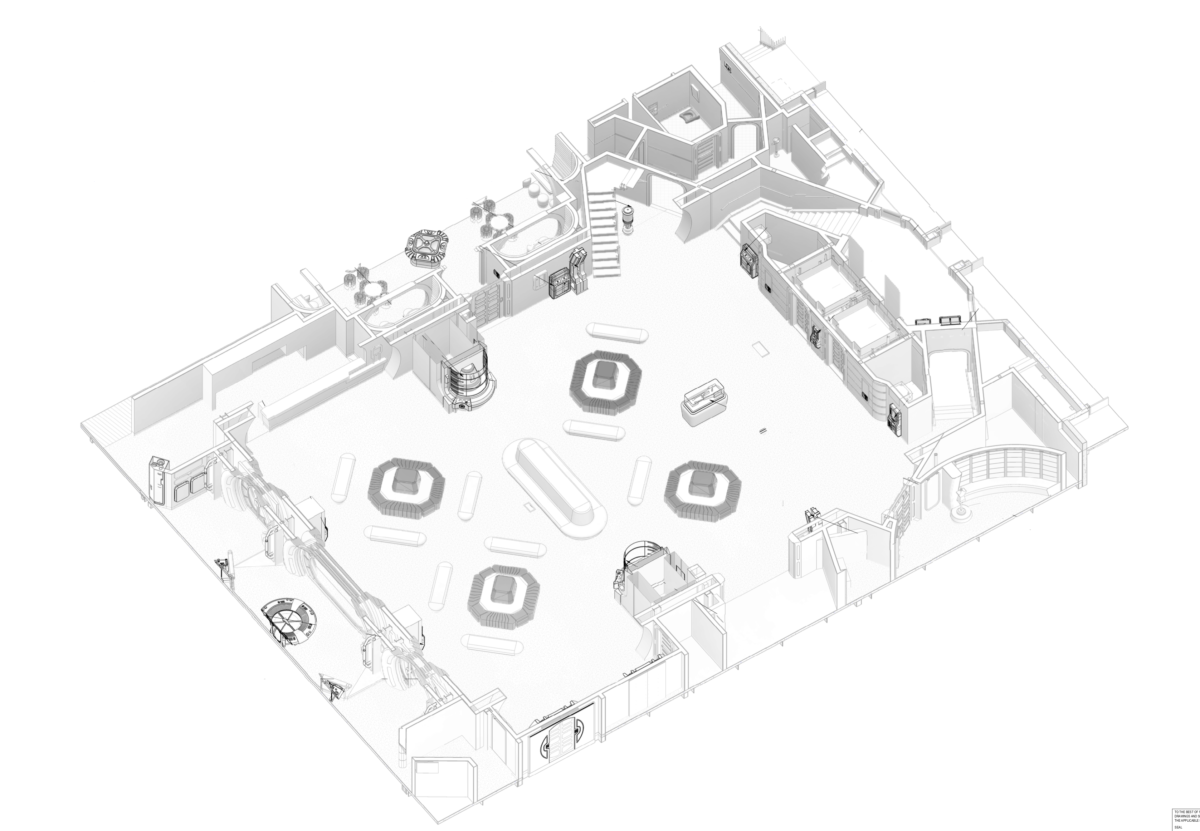 This odd prop above the lobby will be used for a pretty cool moment. If you recall, Ben Solo was born on Chandrila, long before he turned to the Dark Side and became Kylo Ren. One of the highlights of the experience will be an attack by the First Order, likely still looking for the spy from Batuu. Guests will conduct a space assault from the bridge of the ship, but at some point, Kylo Ren will come aboard the ship. Railings and such will spark as laser blasts are fired, but Kylo will supposedly make this large piece on the ceiling “collapse” down towards guests using his Force powers during the show. He’ll also have the ability to pull actors on the ship towards him using his abilities (and special platforms located on the catwalk to make the magical effect happen).