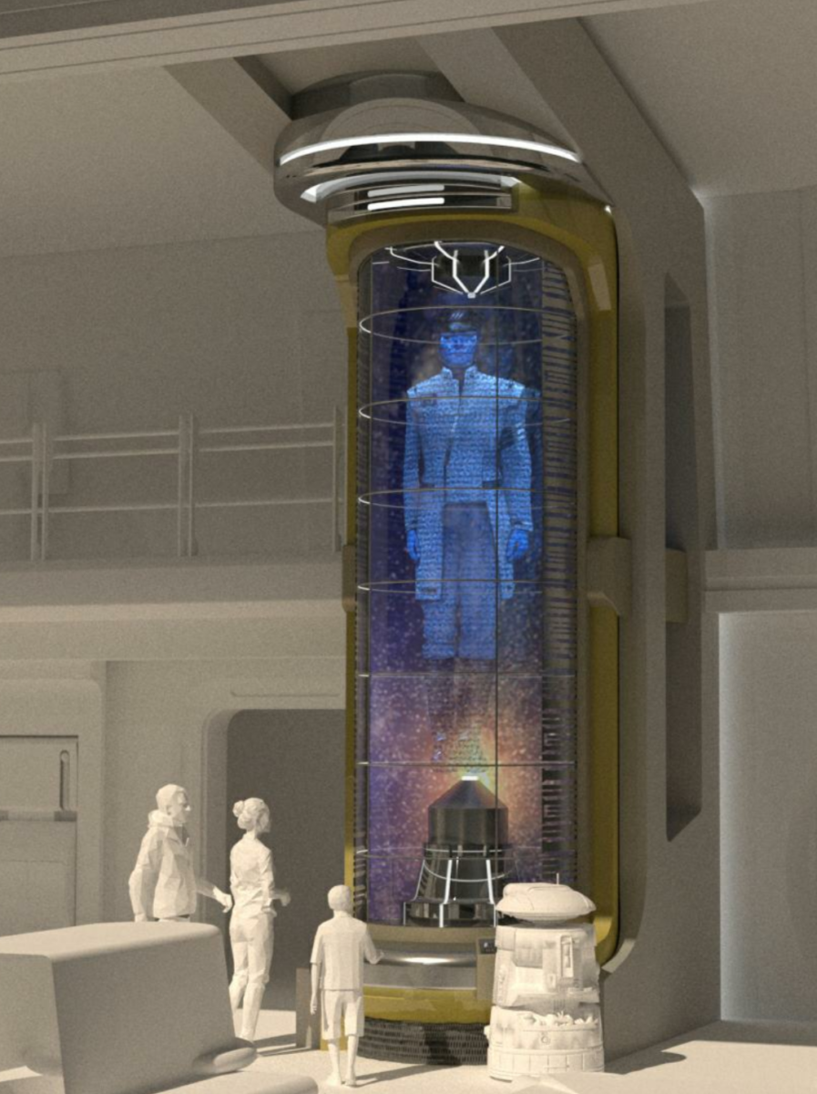 In the lobby, you’ll find a large hologram tube with projections of various characters, perhaps even interacting live with guests. You may even notice s droid plugged into the console, very similar in style to those we expected to see roaming Star Wars: Galaxy’s Edge.