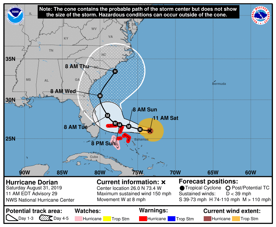 The forecasted track for Hurricane Dorian has been updated to miss Florida, with Dorian now expected to make landfall between Georgia and the Carolinas. Florida is not entirely safe however, as the state remains in the “Cone of Uncertainty” which means a shift in Dorian could put Florida directly in the path of the storm.