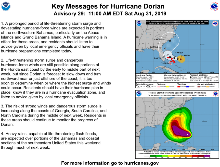 Hurricane Dorian Shifts Further East from Florida, Nearing Category 5 Strength