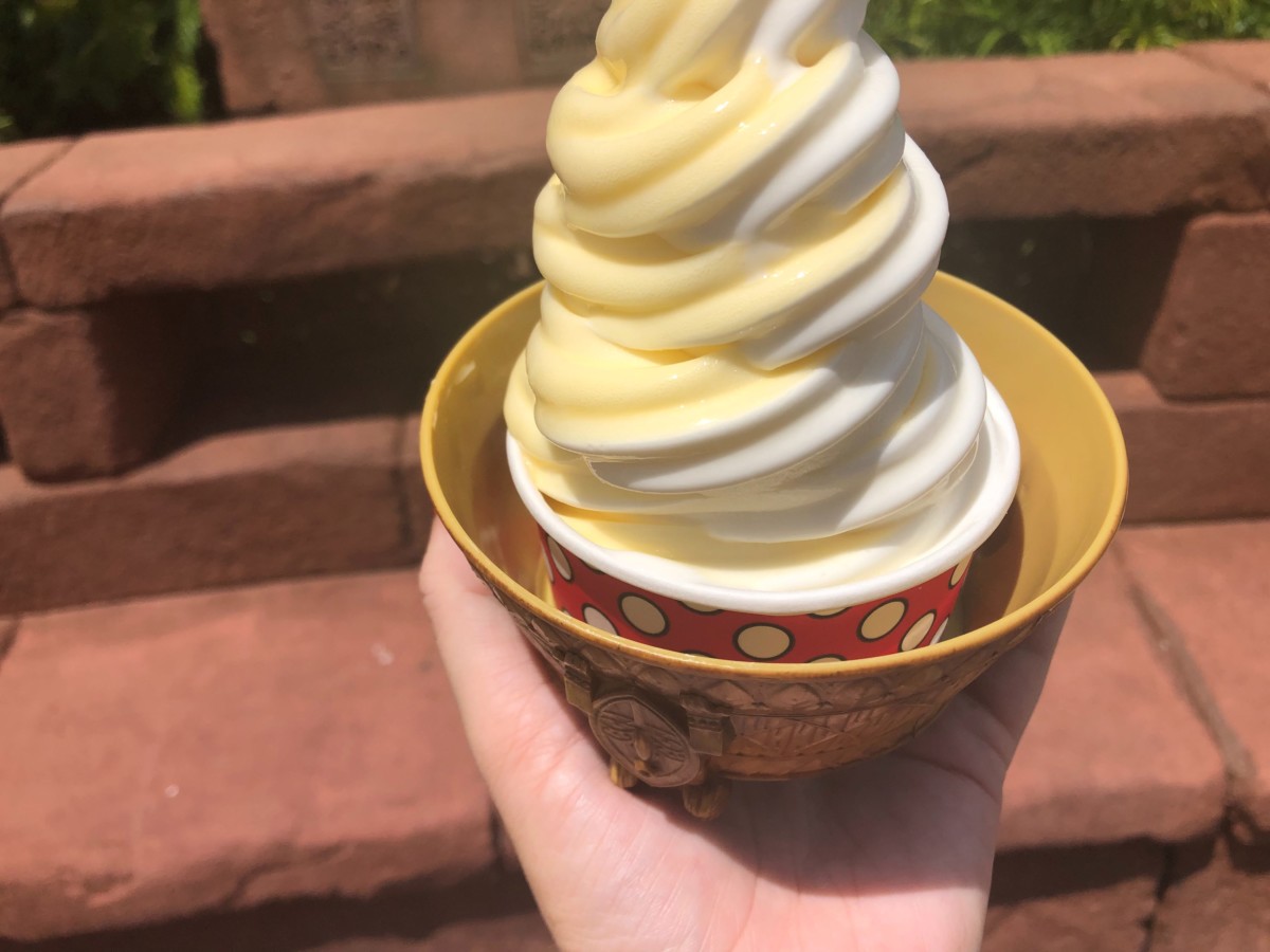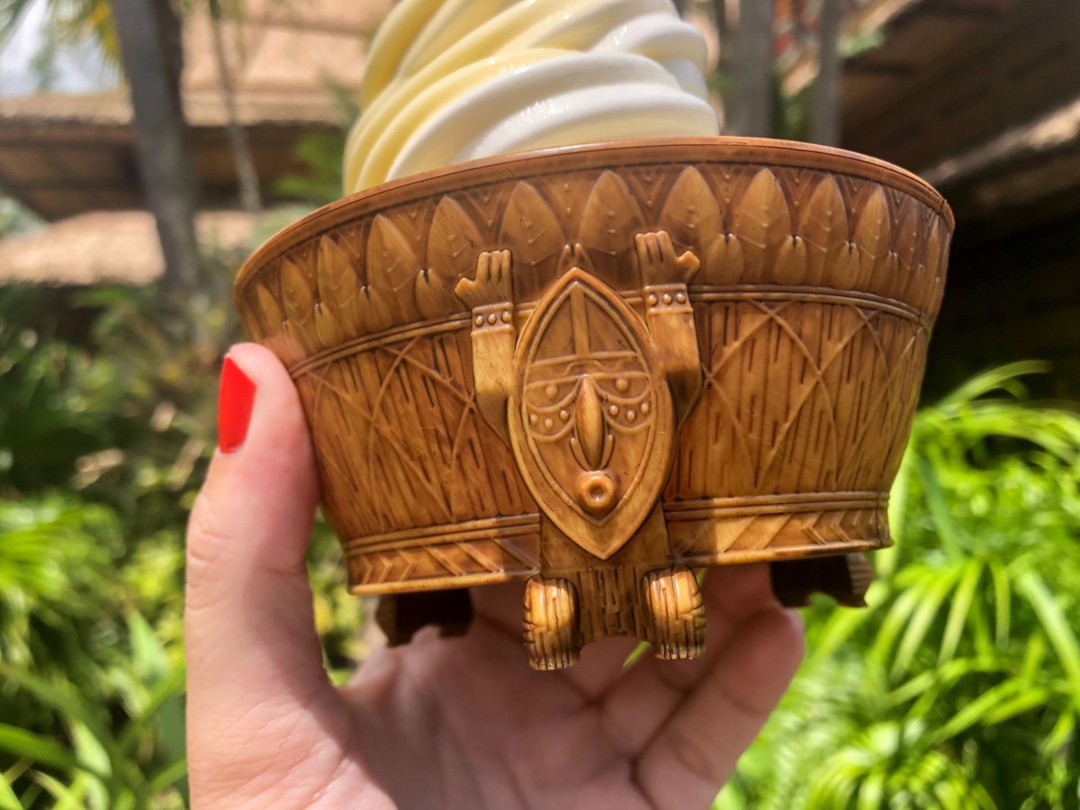 If you hate scrubbing out souvenir bowls, then we have some good news for you! The Dole Whip was served in those cute Mickey and Minnie cups, gently placed inside the bowl. The soft serve does melt quickly, and some will drip over the edge into the plastic bowl, but it’s still so much easier to clean. Hopefully, this is a trend and I never have to relive the nightmare of scrubbing Orange Bird sipper cups again.