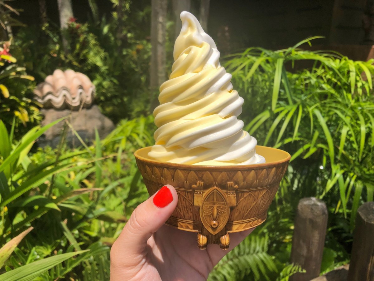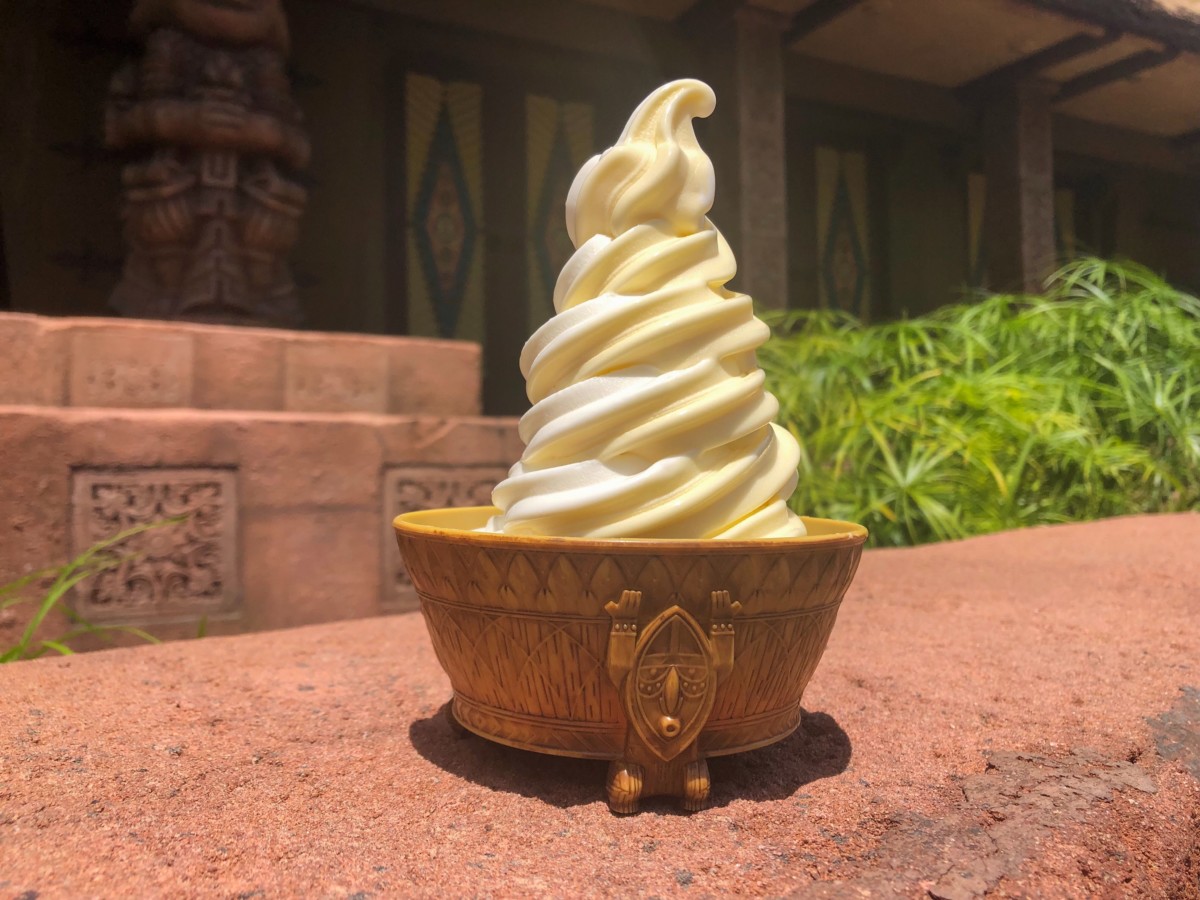 Aloha Isle serves classic pineapple Dole Whip, vanilla, or swirl. You can get it in floats, pineapple upside down cake, or served straight up. The menu now offers your choice of flavor served in a tiki bowl for $9.99.