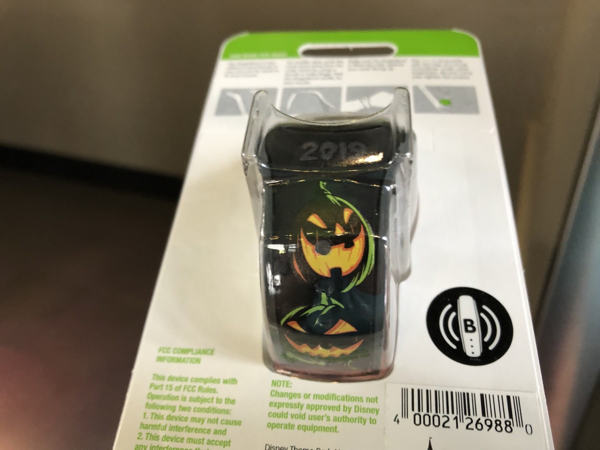 The back of the band has a stack of spooky-looking pumpkins, similar to the decorations found around the Magic Kingdom. The green accents highlighting the pumpkins really looks nice against the black band. “2019” is written is gray, spooky lettering near the puck.