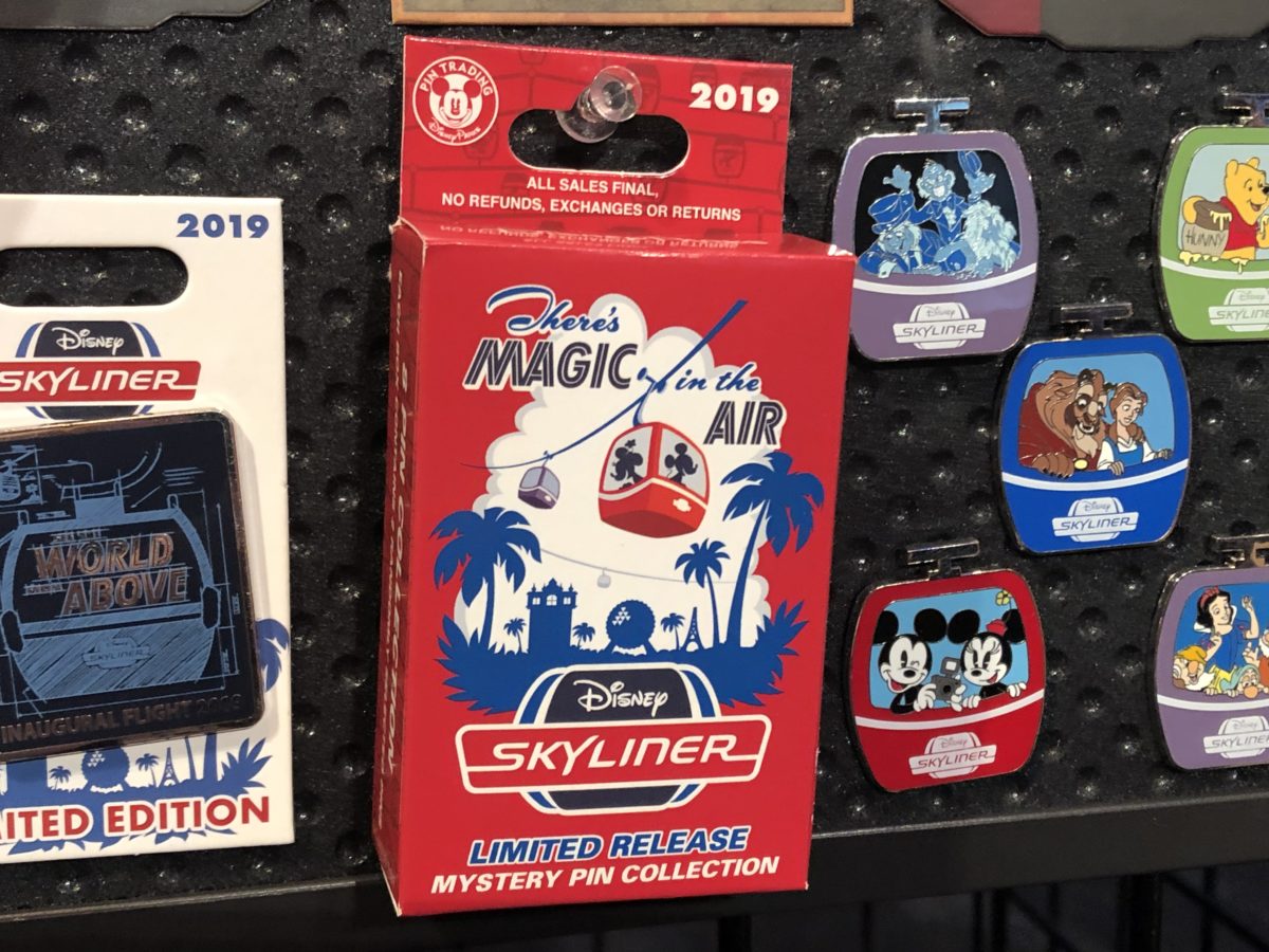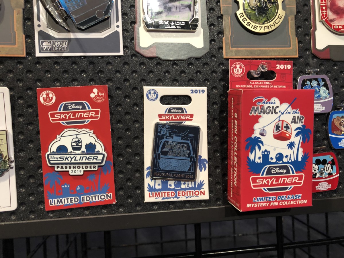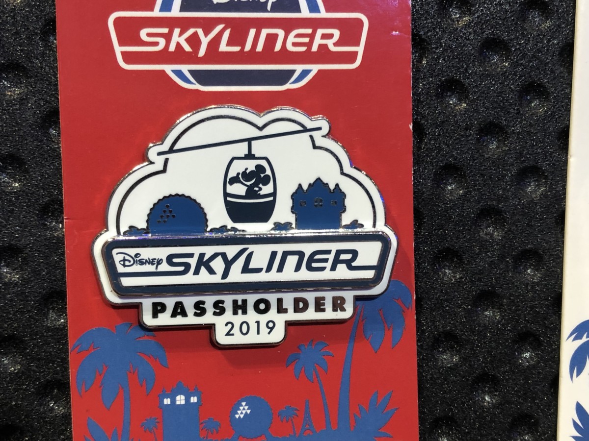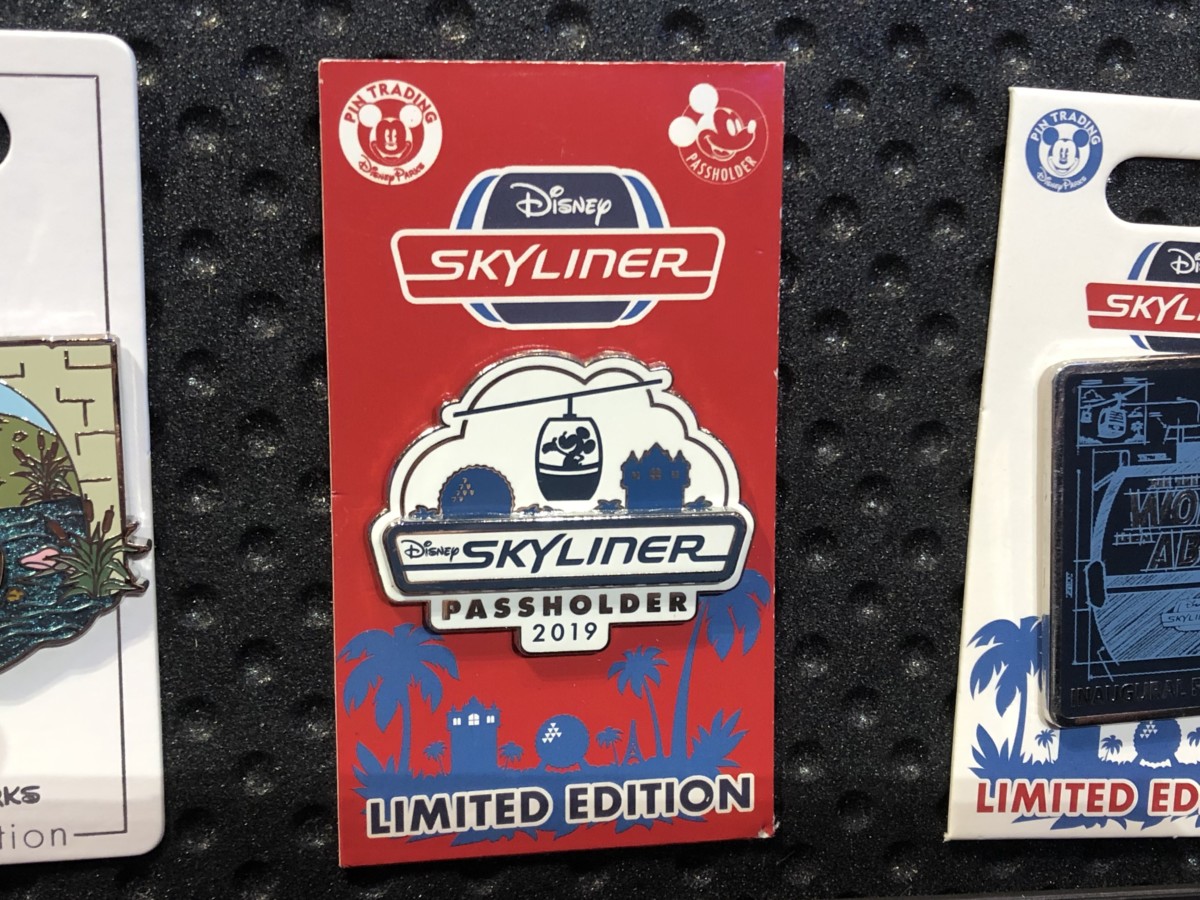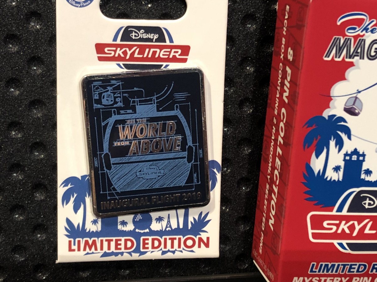 The “Inaugural Flight 2019” pin is limited edition and shows the Skyliner gondola with “World Above” in the window.
