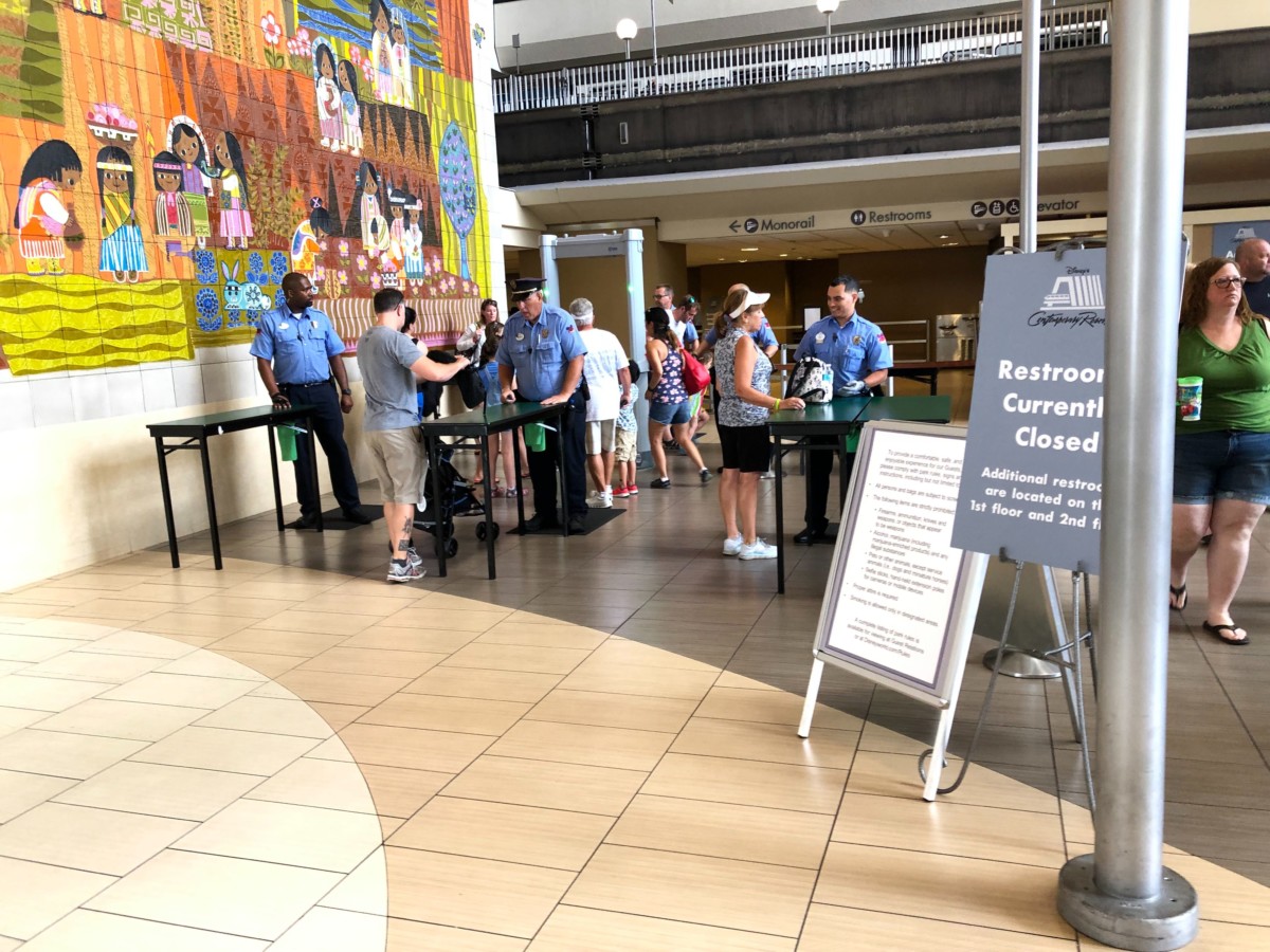 If you’re unfamiliar with the process, guests looking to board the monorail at Disney’s Contemporary Resort pass through bag check and security here before being dropped off at the Magic Kingdom, where they no longer have to pass through another security check.