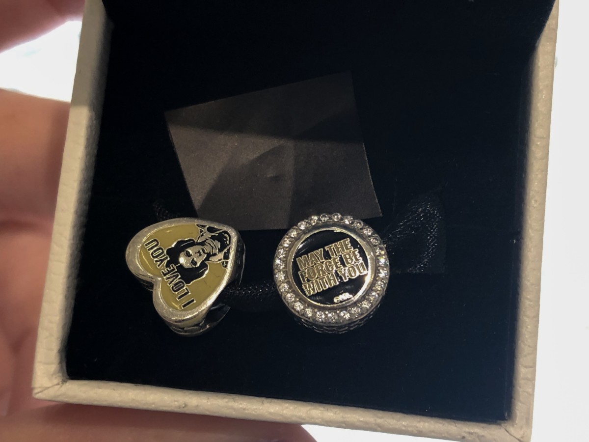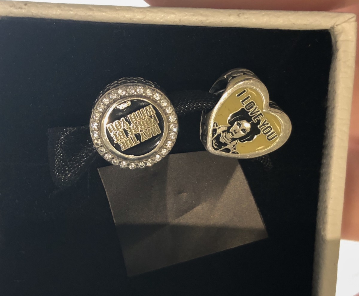 Both charms are double-sided. The heart-shaped charm features Princess Leia on one side and says, “I love you” at the top.