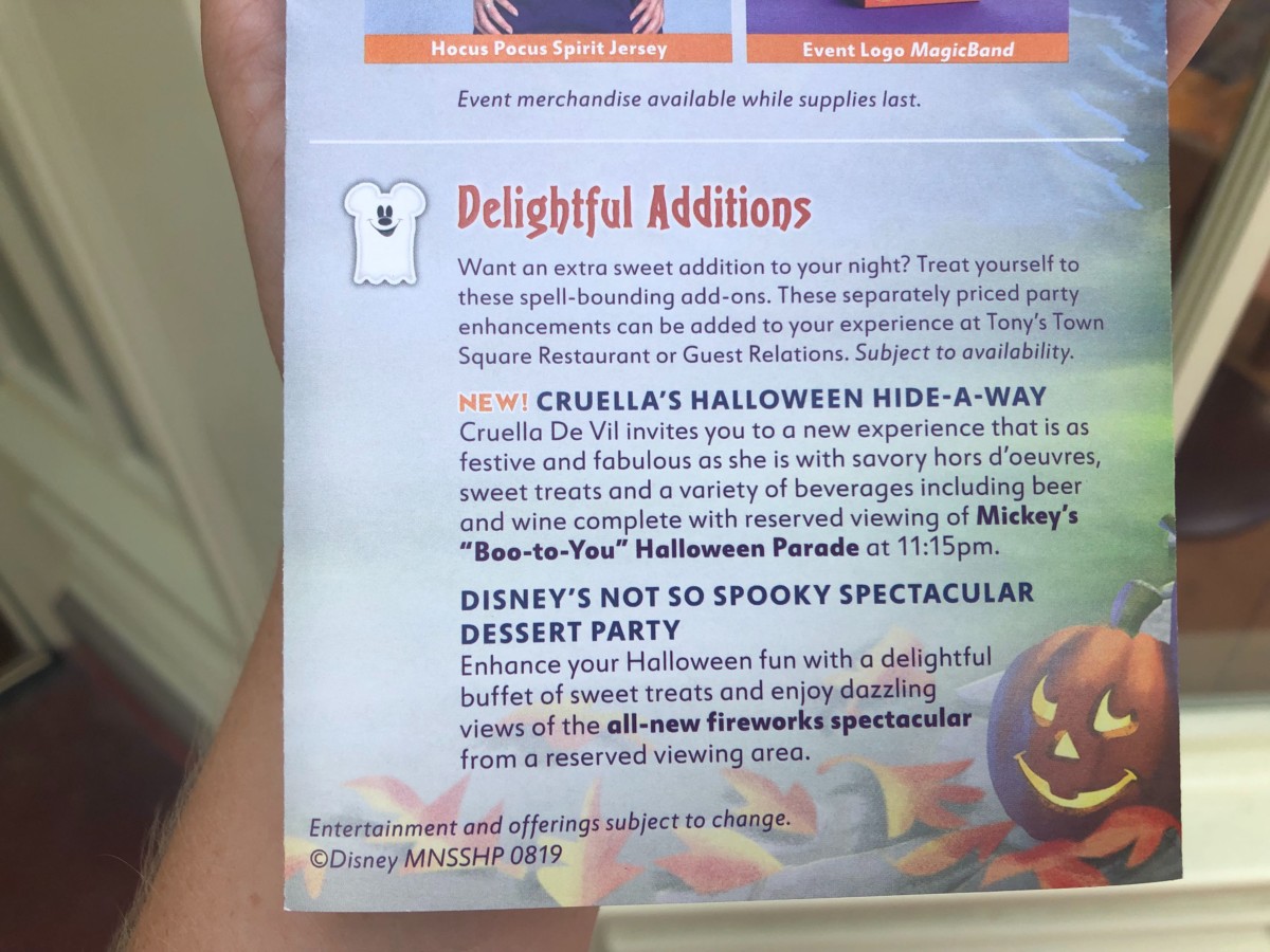 Looking to upgrade your Not-So-Scary experience? There’s also the Cruella’s Halloween Hide-A-Way dining experience at Tony’s Town Square, and the exclusive event dessert party, featuring a reserved viewing area for the all-new fireworks show, available as add-ons to the party.