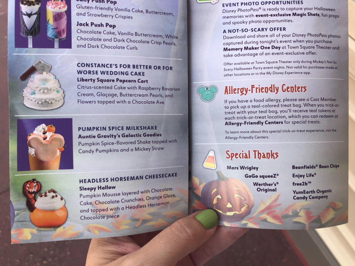 For guests looking to experience an Allergy-Friendly Halloween party, make sure you pick up your teal treat bag and pick up as many teal treat tokens at trick-or-treat locations to exchange at several Allergy-Friendly Centers (marked by teal Mickey shapes on the map) for special treats like GoGo squeeZ packs, Enjoy Life cookies, and organic candies.