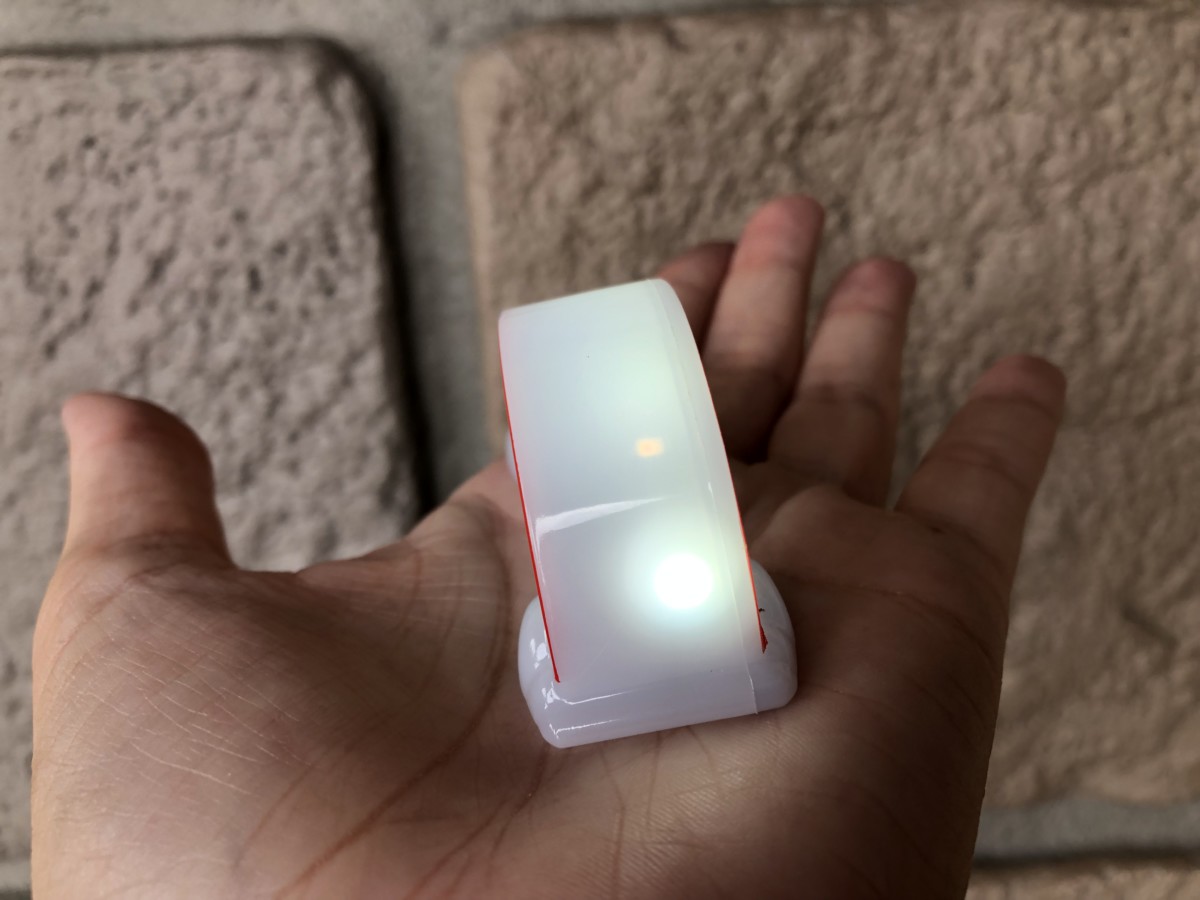 There are 4 different light patterns, from flashing to solid. There’s a tiny white circle on the back that is the button to activate the light.