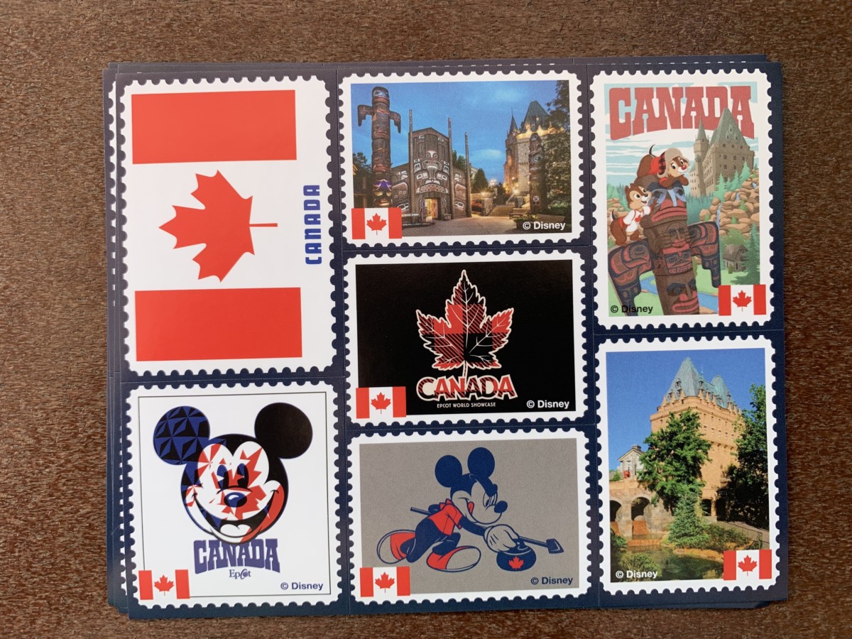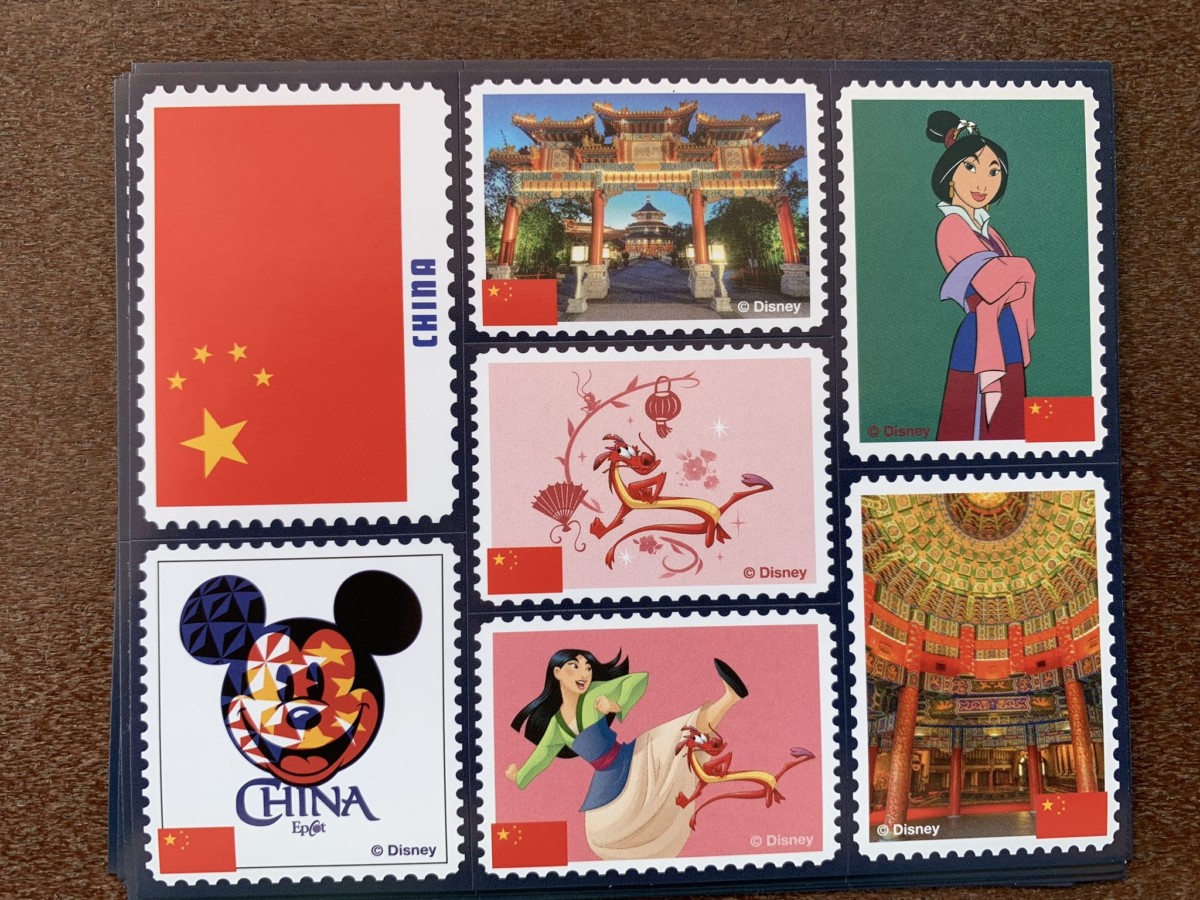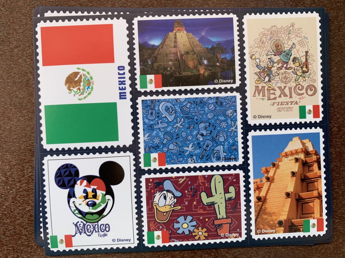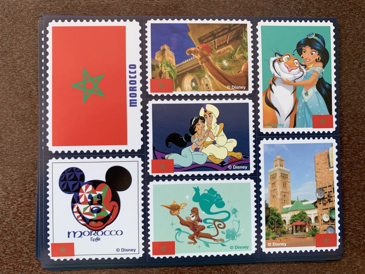 Each country gets a sticker sheet with seven stickers each, representing a mix of location-appropriate Disney characters and landmarks from inside the pavilions.