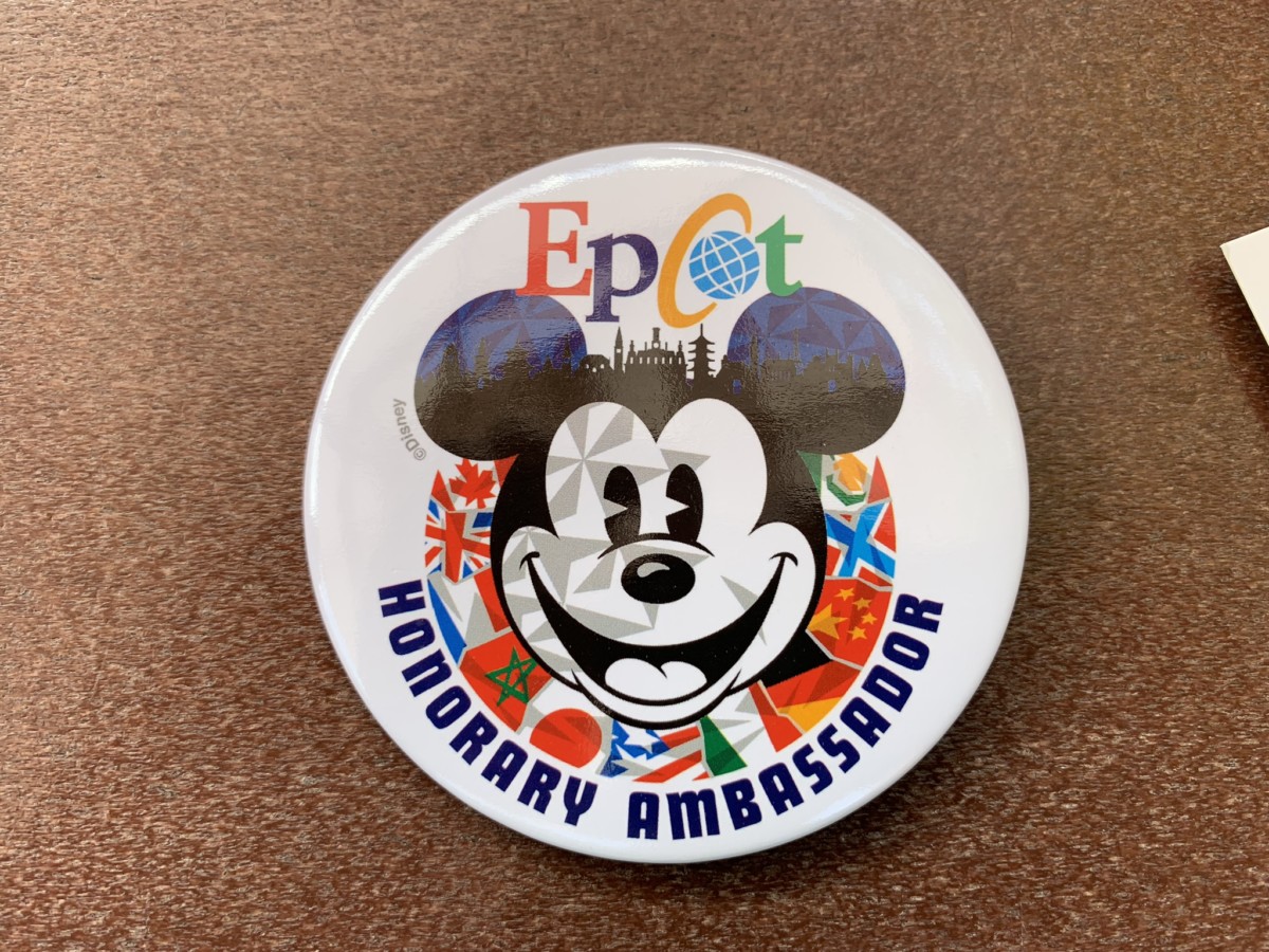 The button matches the current line of World Showcase merchandise available in several locations across the park.
