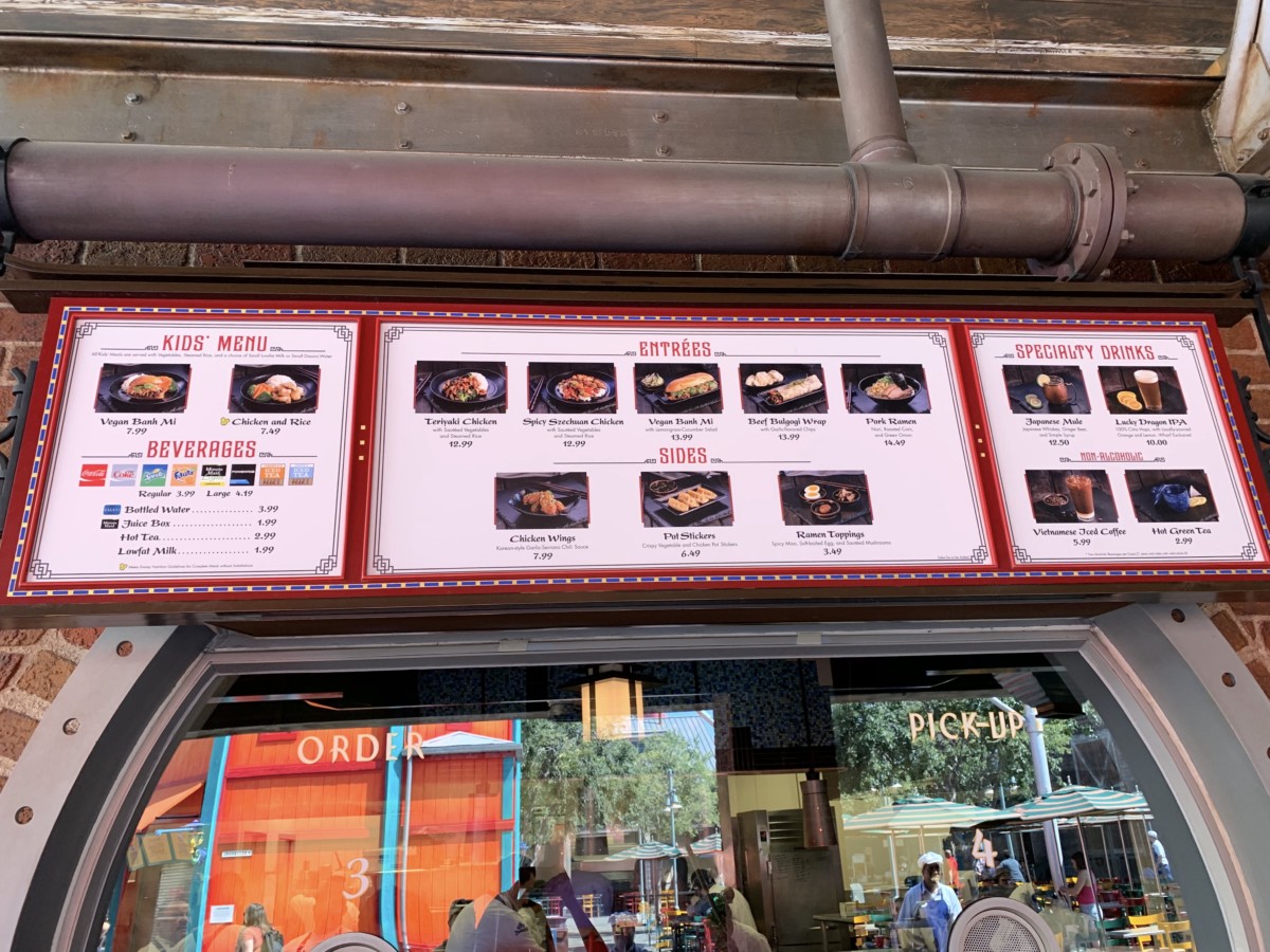 We’re back at the Lucky Fortune Cookery in Disney California Adventure! Actually, we don’t come here often. For years, this has been one of the worst eateries at the park, and we tended to avoid it often. However, the Pacific Rim foods restaurant has officially junked their trademark take-out boxes and debuted an entire new menu, including ramen, bahn mi, and more. Let’s check it out.