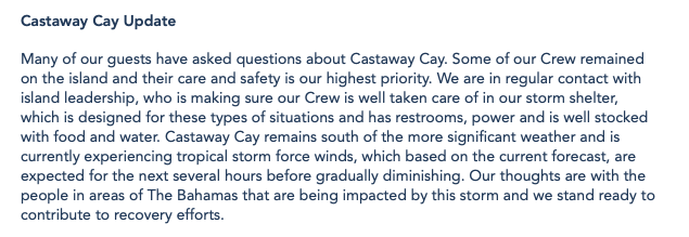 “I understand your concern, as they are our co-workers. Castaway is south of the more significant weather. [Disney Cruise Lines] is in regular contact with island leadership and all are safe. Forecast calls for tropical storm force winds, which is what is there now. There are extensive measures in place to keep crew safe. A shelter on the island houses all crew and is stocked with a plentiful supply of food and water. “