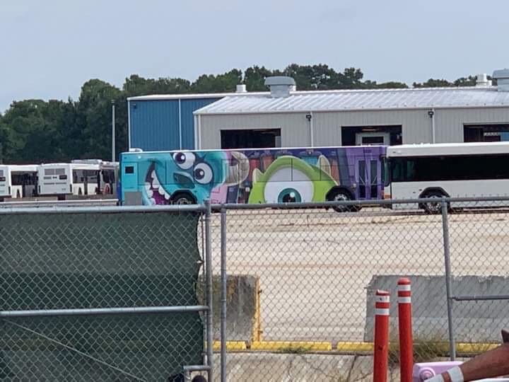 Just yesterday, we caught glimpse of the new Lion King bus, but this is the first Disney Pixar bus to make it onto the lot! The purple-skinned bus features Mike and Sulley as they peer down on guests across property, with a row of door portals zooming past them.