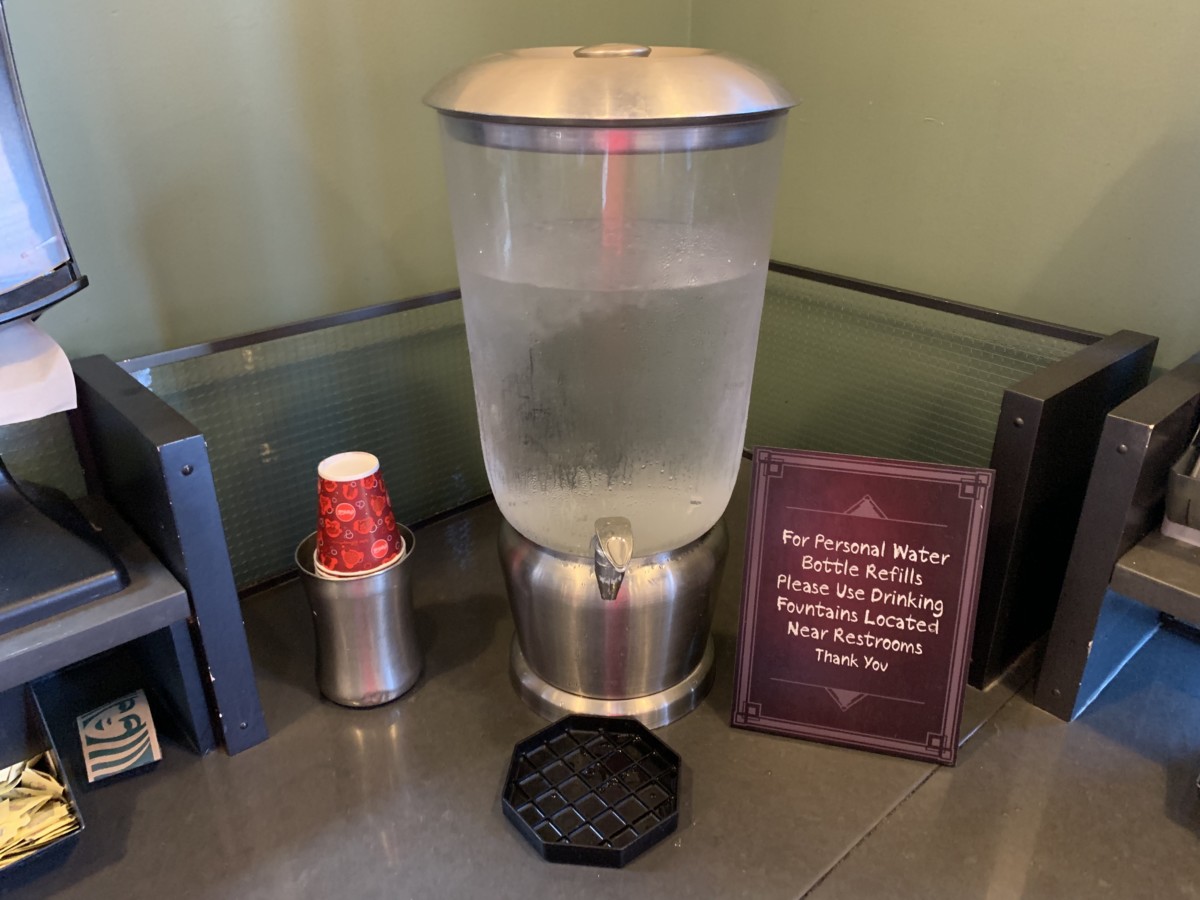 We headed into the Trolley Car Cafe next, also known as Starbucks. Note the free water station is still available, as well as the sign urging guests to not use the station to fill their personal water bottles, which has become a reoccurring problem.