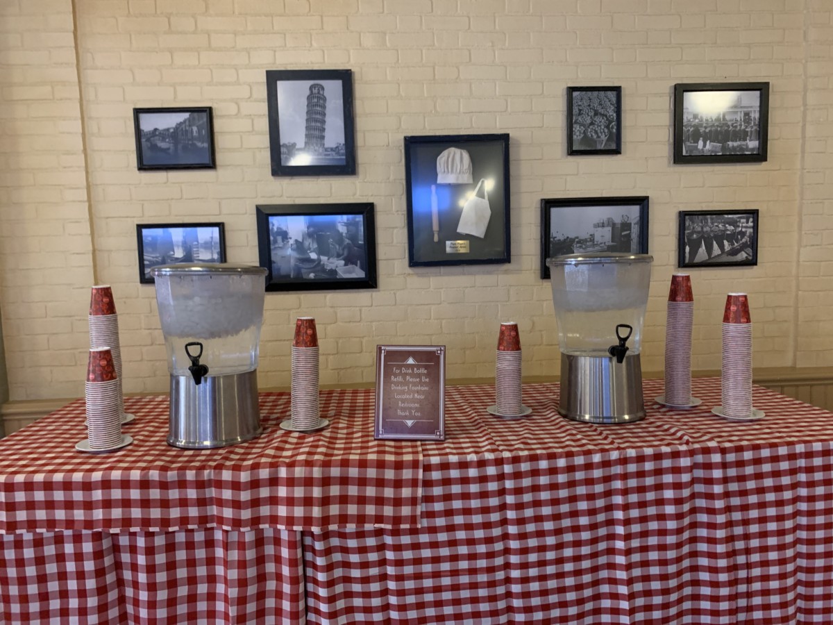 The water station at Pizzerizzo is still in place, again, with the same signage urging guests not to fill personal water bottles!