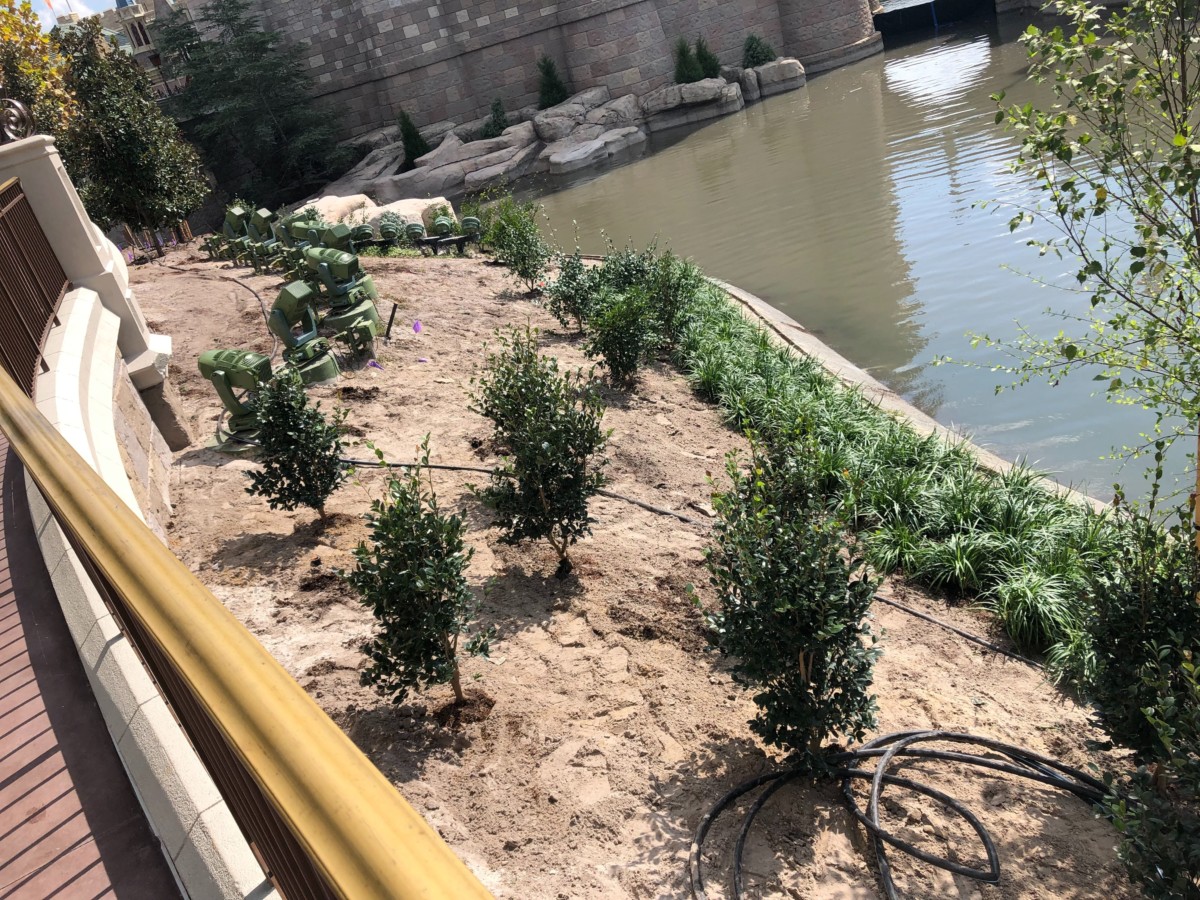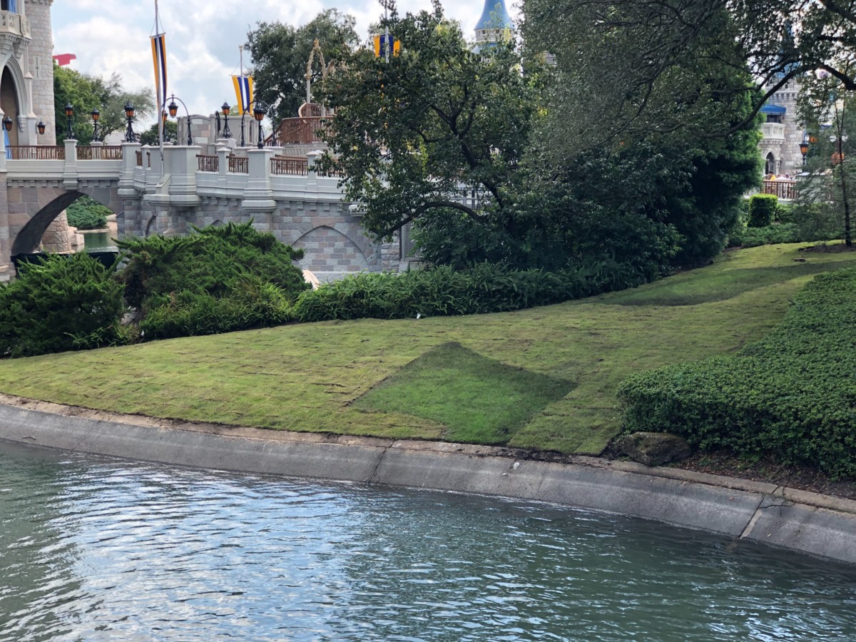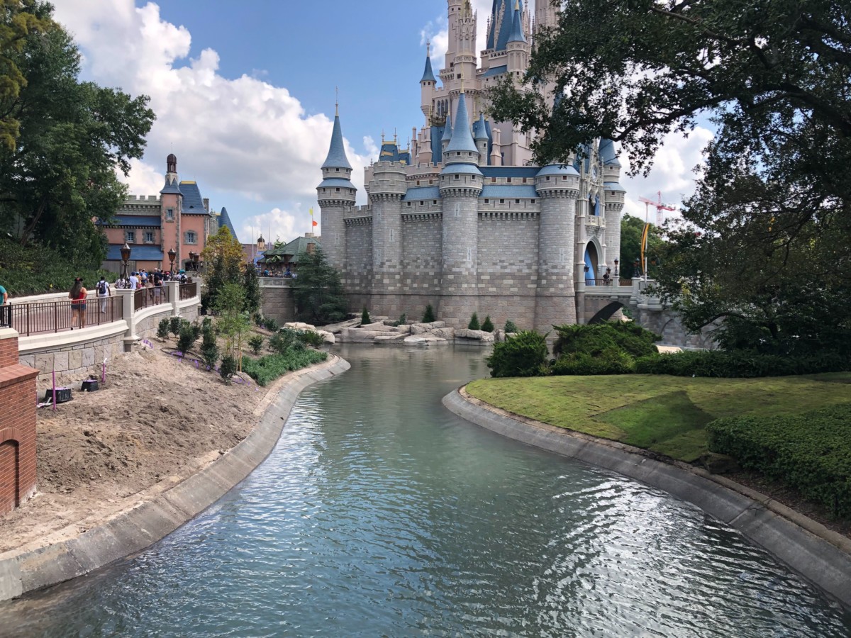 We’re excited to see the beautiful foliage coming together along the Cinderella Castle pathway. Patches of grass line the little hill farthest away from the path. They seem to be refilling the moat slowly, and it already looks so much prettier. We can’t wait until it’s lush and green all around, and we have a full moat!