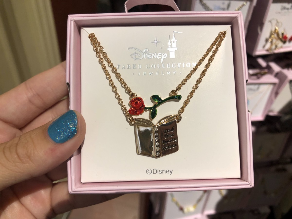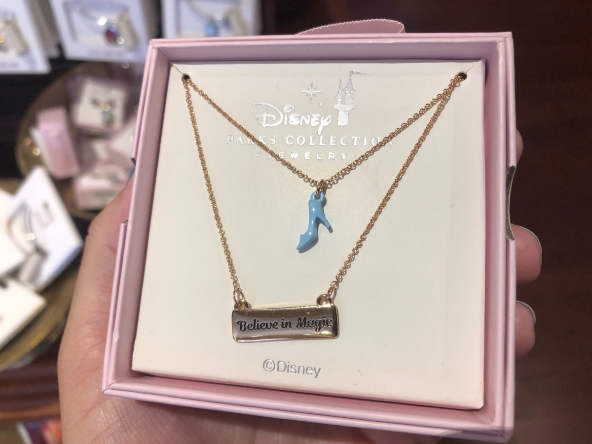 We also found these princess necklace sets for $19.99 each. “Find True Beauty Within” is written on the book, and the rose is on the other chain. Cinderella’s glass slipper and “Believe in Magic” look so cute together.