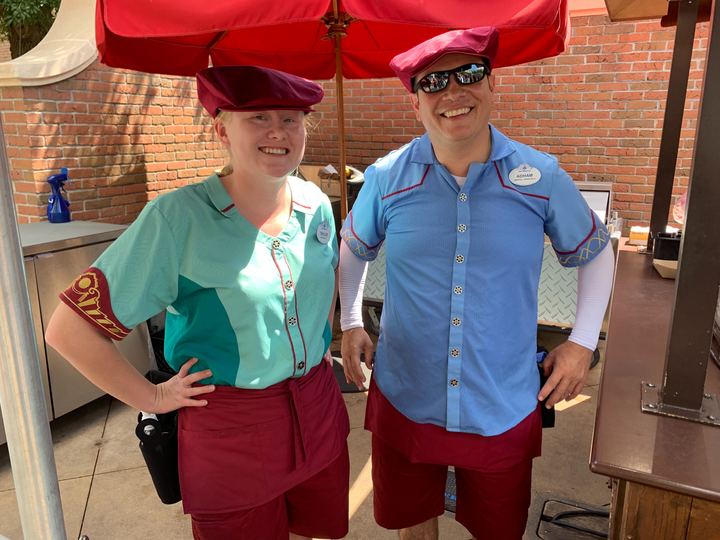 While at Hollywood Studios this morning for our Reflections of Forever event, we spotted some new Cast Member costumes at the Trolley Car Cafe. Well, as we kept walking, we found out almost all of the Cast Members who work in the Echo Lake food and beverage section of the part got some fancy new costumes as well!