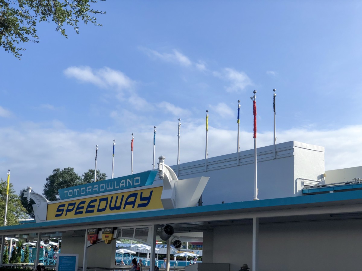 Even more flags are zip tied in Tomorrowland over the Tomorrowland Speedway.