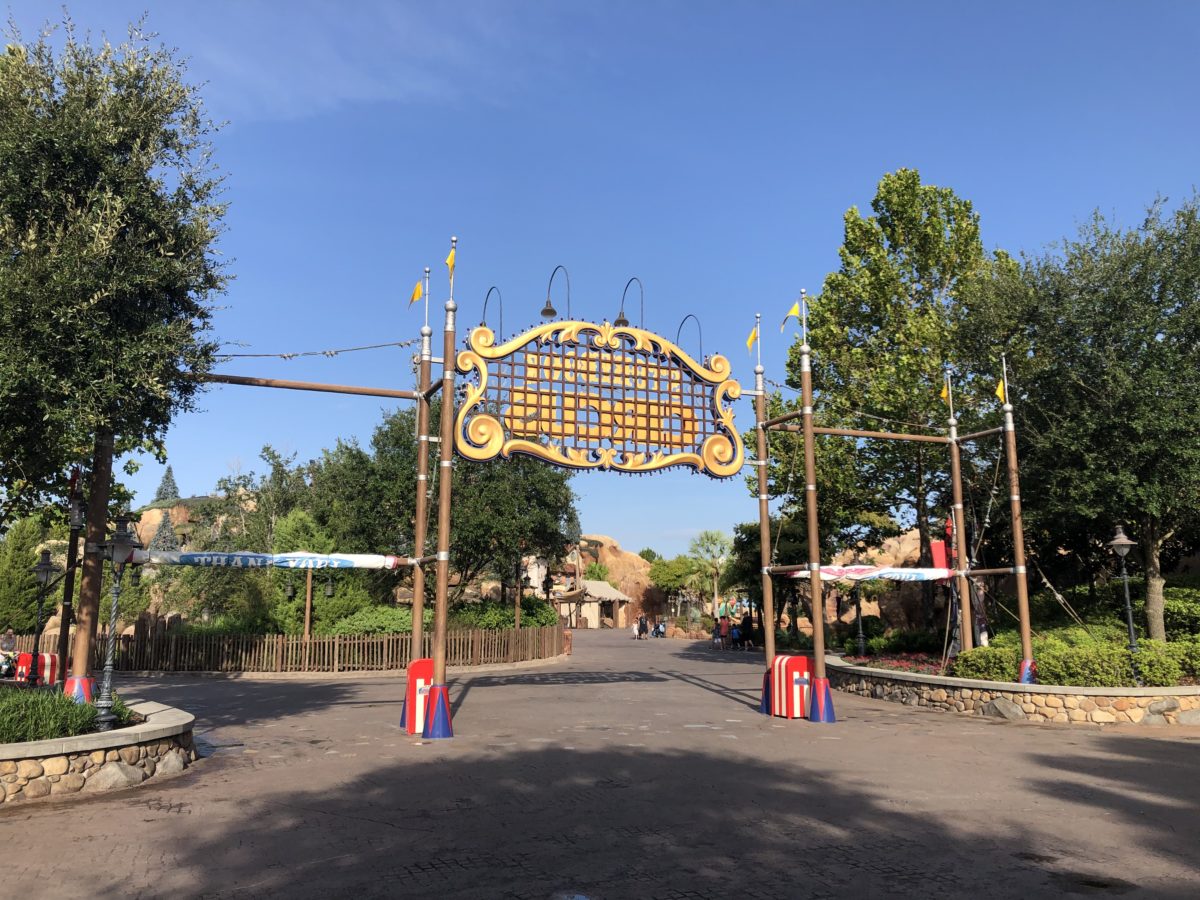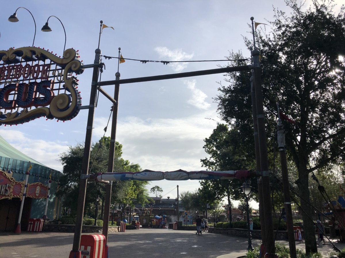 The larger banners around the Storybook Circus entrance have been rolled up and secured.
