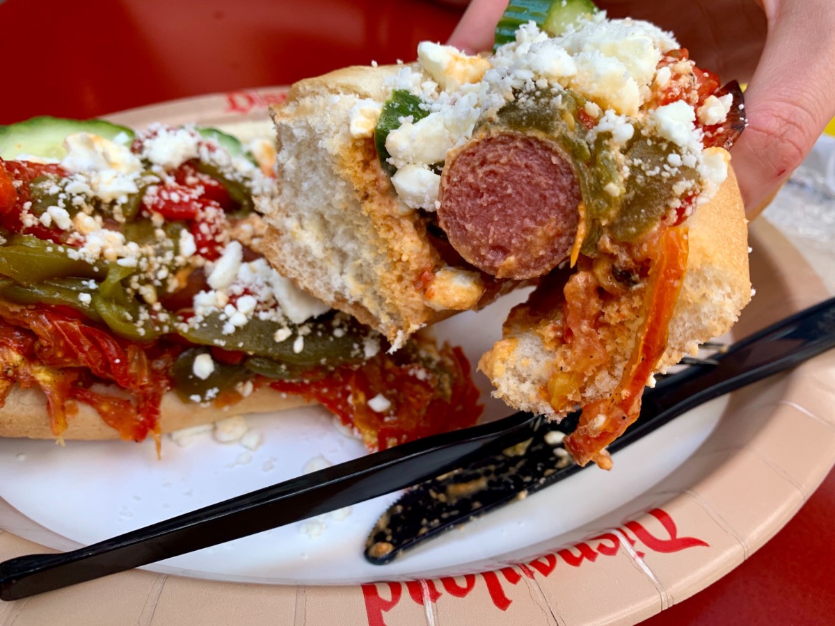 It’s a spicy hot dog! If you can’t handle spicy food, this might be too much for you. It’s also really messy.
