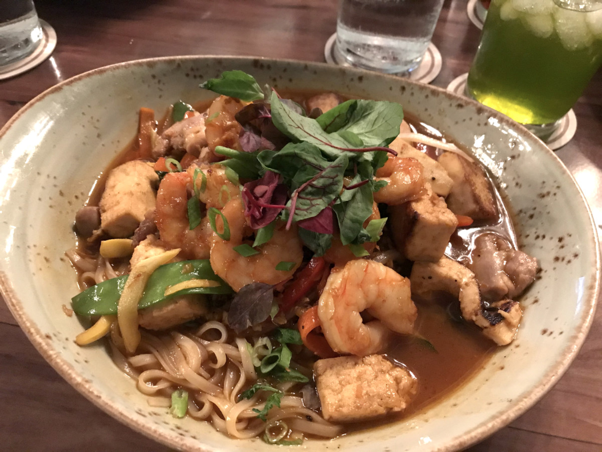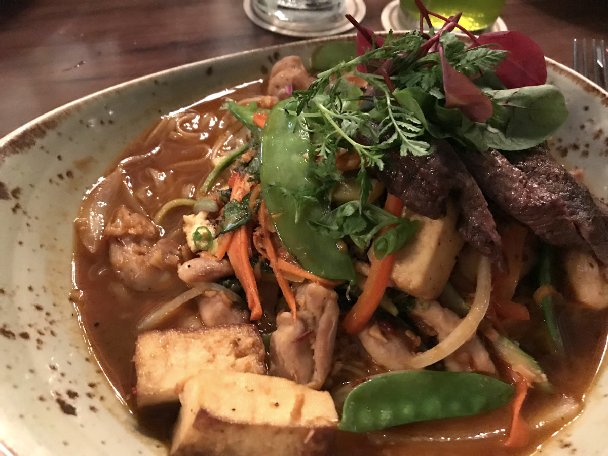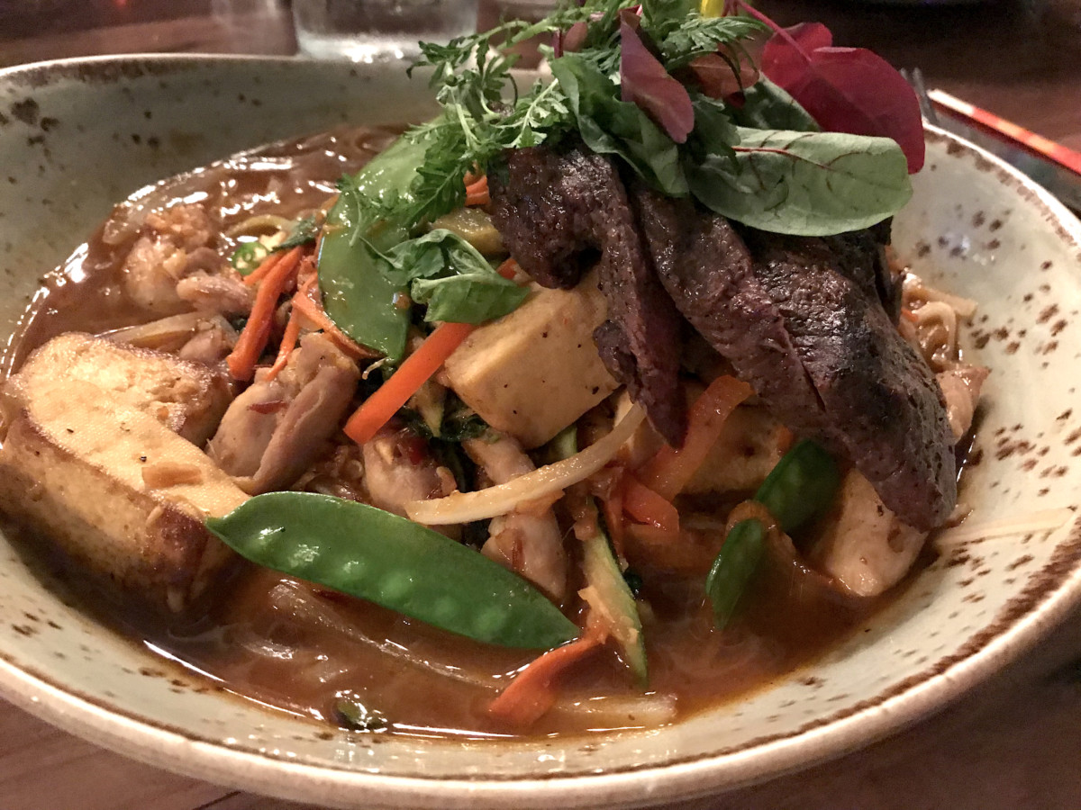 The shrimp were rather large and seared and coated perfectly with sauce, so that was a big surprise, again, for what is otherwise just an add-on to a meal. It’s nice they didn’t just toss some poached defrosted salad shrimp on there. While I assumed that shrimp would be the better pairing here since Pad Thai is usually served with shrimp, the steak ended up winning out as it was irrefutably juicier and tastier.