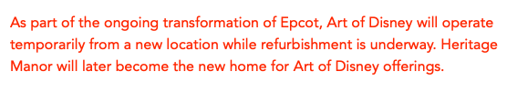 At Art of Disney, which was scheduled to have its final day of operation today, September 7th, it appears the scheduled closure has been delayed for a few more months. According to Cast Members at the location, Art of Disney won’t be closing until December 15th. They also mentioned that the location would reopen on December 16th at the American Adventure.
