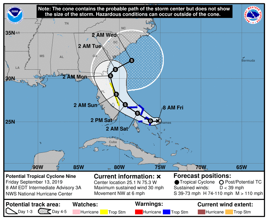 Tropical Cyclone Nine is expected to become a Tropical Storm and bring tropical-storce-winds to areas of the Bahamas and Florida.