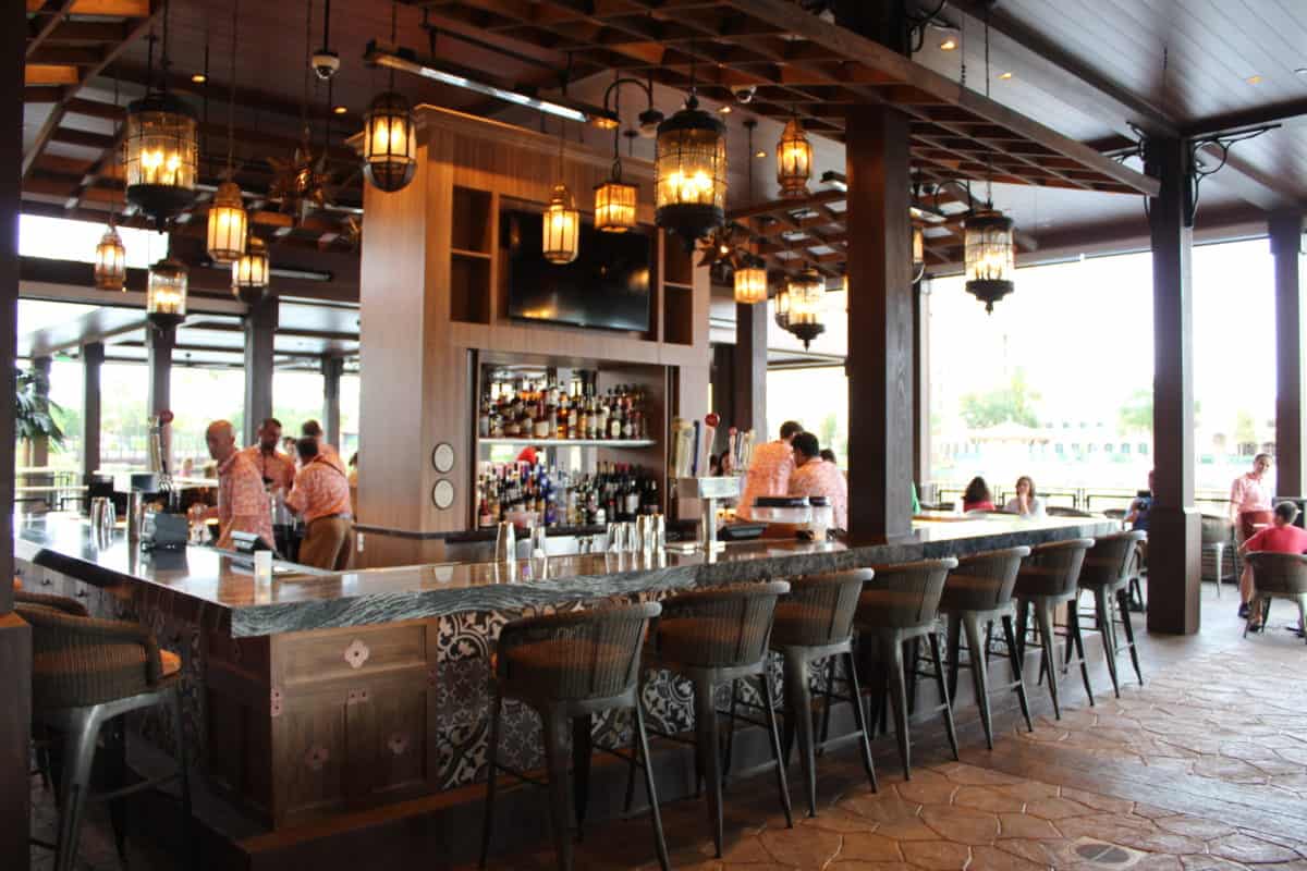 Three Bridges Bar & Grill at Villa del Lago – Situated in the center of the Lago Dorado lagoon, where the three bridges connect, is an open-air bungalow with sweeping views of Disney’s Coronado Springs Resort. The bar and grill is a welcome spot for drinks, appetizers, and a few meal options. The full-service bar has resort specialty drinks that favor gin as an ingredient. However, they can certainly accommodate the preferences of all guests with a full bar selection. This is a wonderful spot to kick back and enjoy a relaxing sunset and talk about the adventures of the day.
