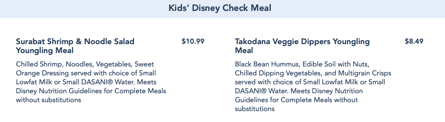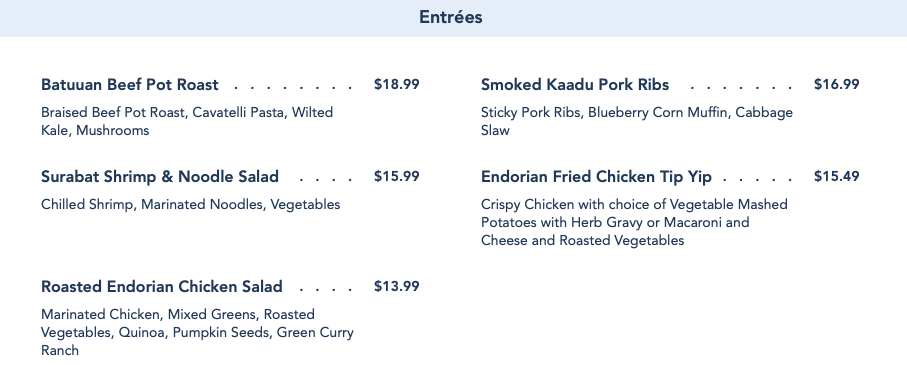 Moving on to entrees, the Shaak Roast is now the Batuuan Beef Pot Roast. You have the Galaxy’s Edge tie-in, plus the name of what the food item actually is. It’s the best of both planets. Same goes for Smoked Kaadu Pork Ribs and Endorian Fried Chicken Tip Yip, which is literally a mashup of both names. It’s interesting to note that Yobshrimp Noodle Salad was renamed to Surabat Shrimp & Noodle Salad, as they couldn’t quite keep it as “Yobshrimp Shrimp & Noodle Salad”.