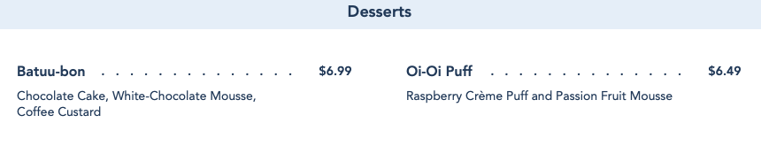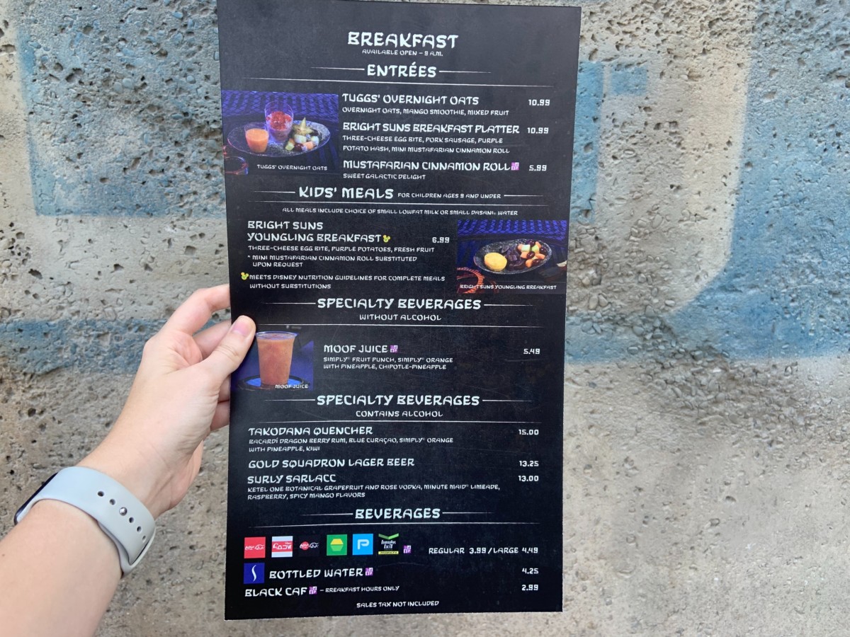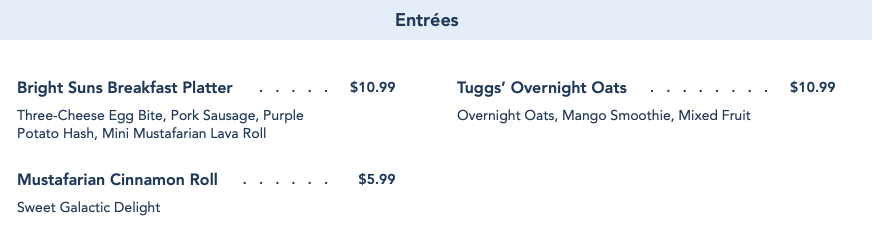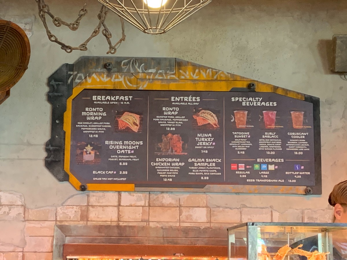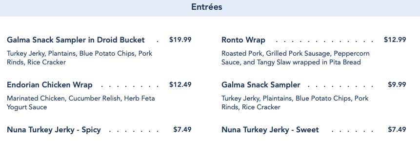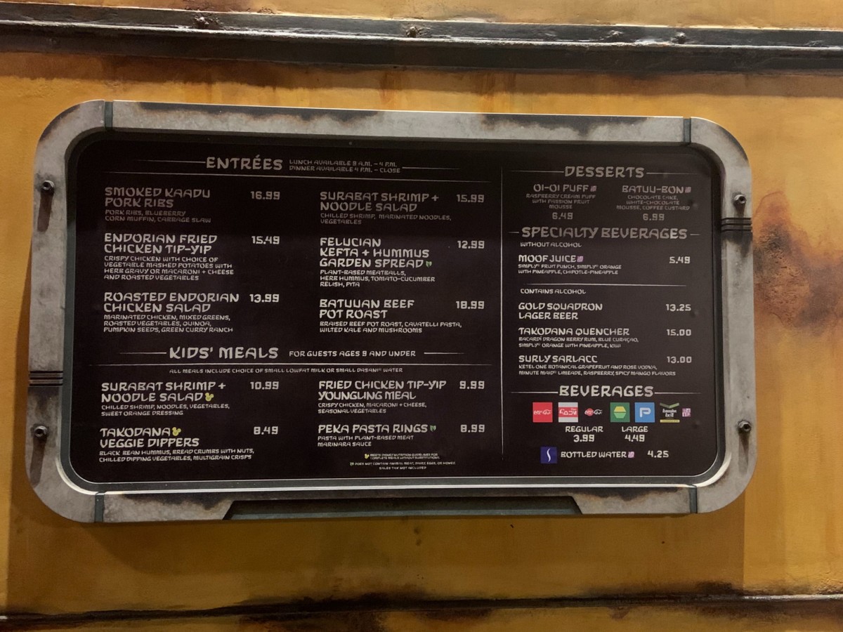 All along, the Breakfast menu had been our main clue as to what the finalized menus would look like. Mustafarian Lava Roll has been renamed to the Mustafarian Cinnamon Roll, while Tugg’s Morning Oats is renamed as Tugg’s Overnight Oats, and the Bright Suns Morning is now the Bright Suns Breakfast Platter. These names blend the original, Star Wars tie-in names with more straightforward food names.